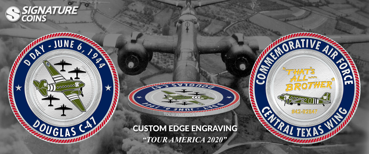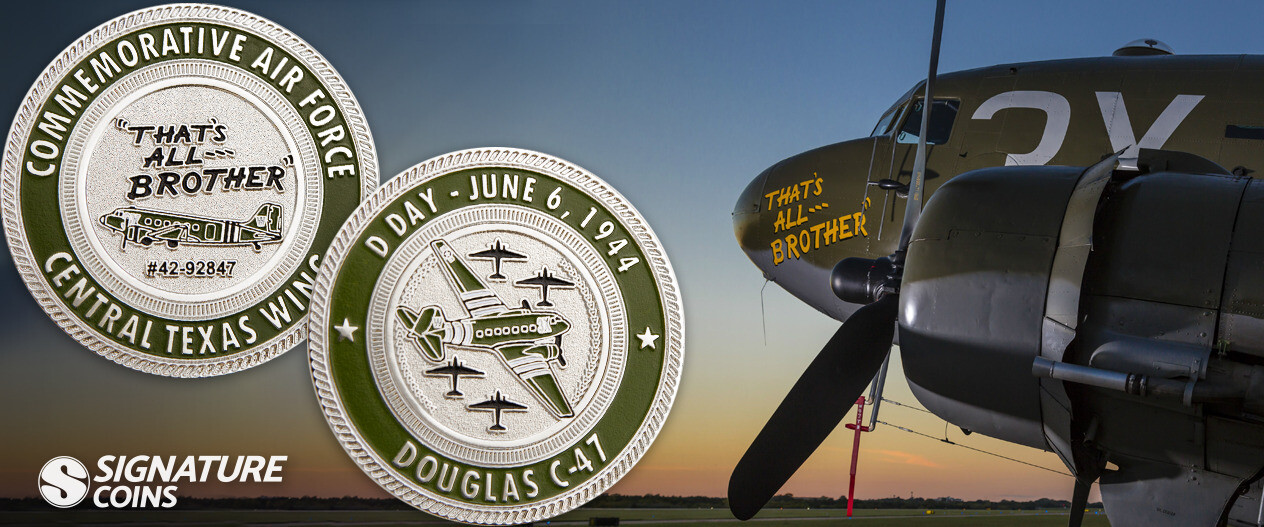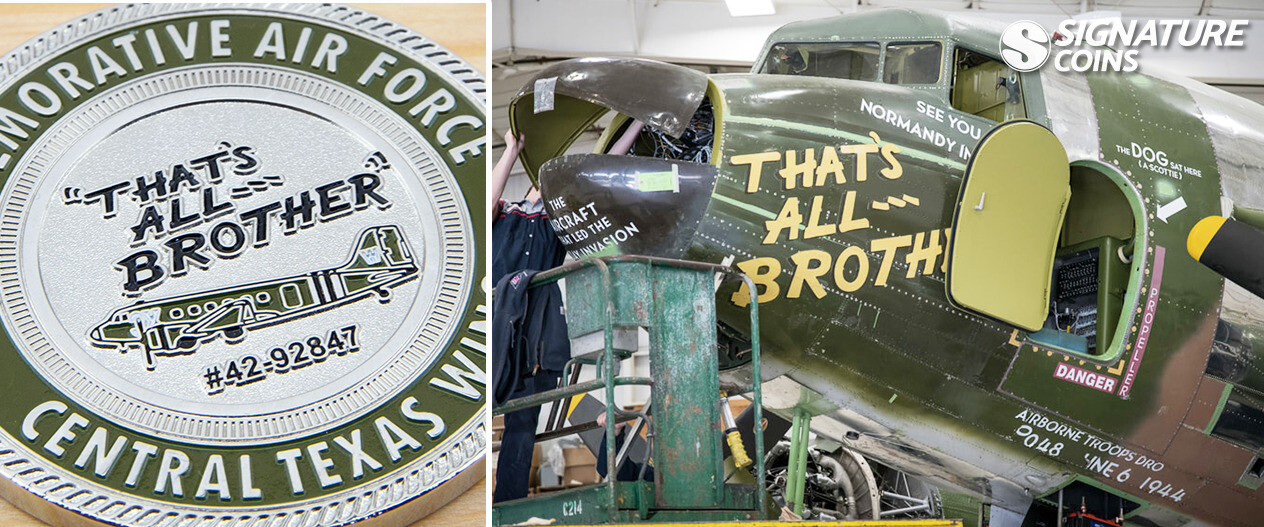 We are honored to work with all kinds of non-profits to create one-of-a-kind challenge coins to help raise money, spread the word on important causes and even experience a real piece of world history in the case of the CAF. The That’s All, Brother challenge coins will be close at hand during her last flight to Normandy.