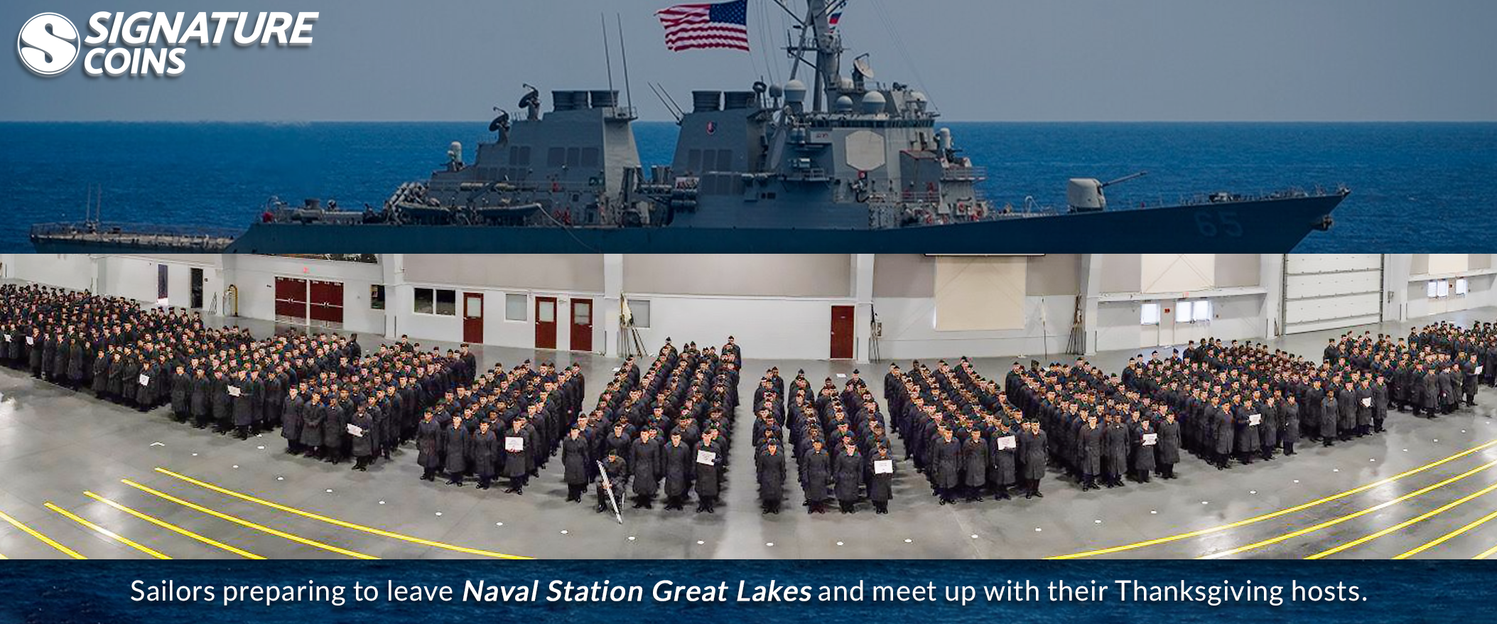 As Thanksgiving day comes to a close, the recruits are loaded up onto a bus and taken back to Naval Station Great Lakes to finish their last few weeks of basic training. The Hammond Mohawks make sure that the Adopt-a-Sailor event is full of familiar Thanksgiving traditions like a home-cooked turkey dinner and time with family, even if it’s just a skype call, but they also make sure to introduce one new military tradition. Challenge coins are not your everyday Thanksgiving tradition, but they will be a big part of each recruit’s military life from that day on.