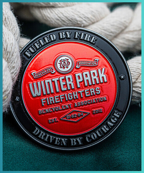 This coin, 2.5 inches in size with bold enamel coloring on both sides and a 3D fire truck design on the front of the coin, is modeled after one of Winter Park’s own fire trucks. This custom challenge coin encapsulates the spirit of the department and serves as a symbol of their unwavering commitment to the community.