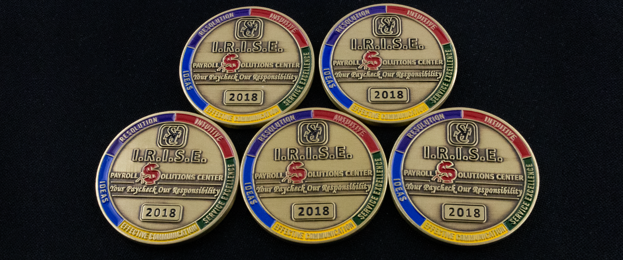 This series of coins was created by Service Corporation International’s (SCI’s) payroll solutions center. For a number of years, SCI has continued to partner with Signature Coins to produce these I.R.I.S.E. coins for their employee recognition program. All five coins in the series share a common reverse side, while each obverse side depicts a different quality or merit SCI wants their employees to personify.