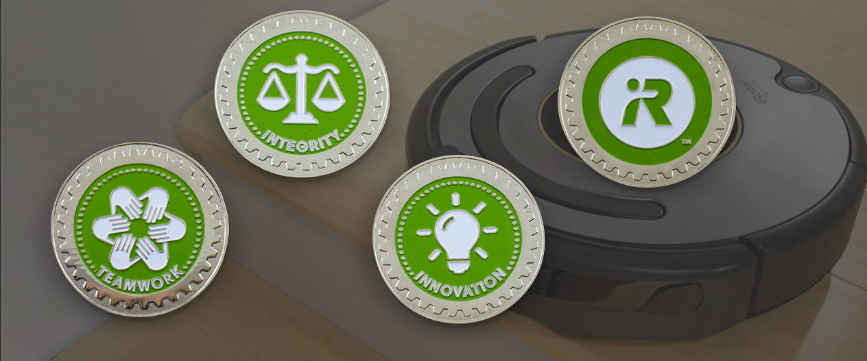 The pictures below show a coin series that Signature Coins made for iRobot (the makers of the Roomba). Just like the SCI coins, these were created for use in an employee recognition program. But they serve the dual purpose of rewarding employees and continuing the branding efforts of the company. The person who contacted Signature Coins on behalf of iRobot said, “My top design priorities with this coin are to continue using our brand font (Harmonia, I can provide if needed), ensuring that the green matches our Pantone 369C green, and making sure there’s some clear space around our logo.”