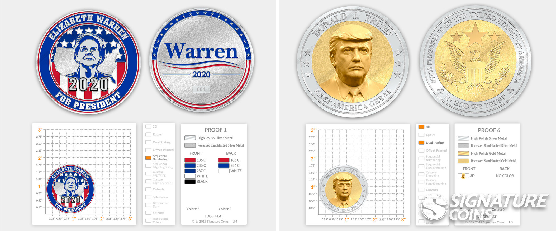 Neither of these coins were ordered by the actual campaign staff of President Trump or Elizabeth Warren. They were designed and ordered by supporters of each candidate as commemorative items. The Elizabeth Warren coin, for example, is a campaign coin ordered by a private group that hosted a fundraiser for her 2020 presidential bid. They were delivered in clear coin capsules to everyone that attended the fundraiser as a special keepsake to take home and share with others.