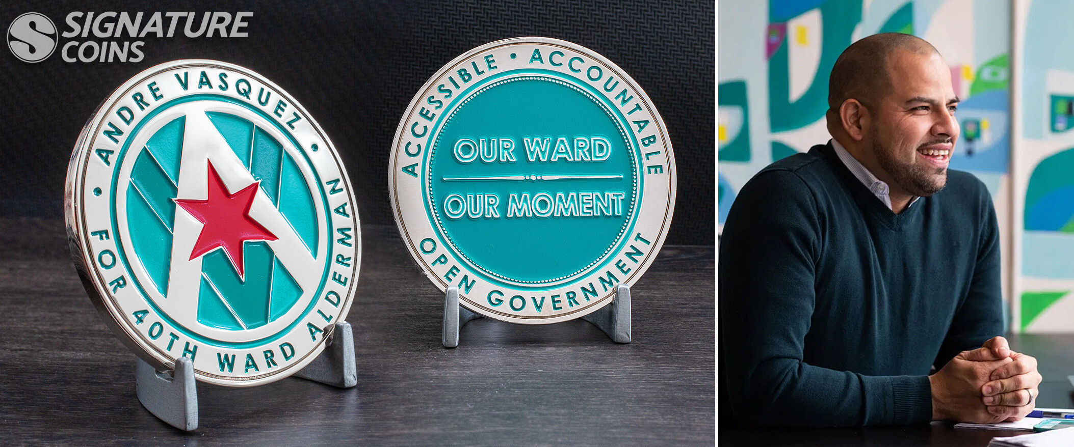 When Andre Vasquez was running for 40th Ward Alderman, he chose a different route for his campaign coin design. Instead of referencing local landmarks, his coins look more like a personal brand. The red star superimposed over the overlapping “V” and “A” (for Andre Vasquez) creates a striking effect.