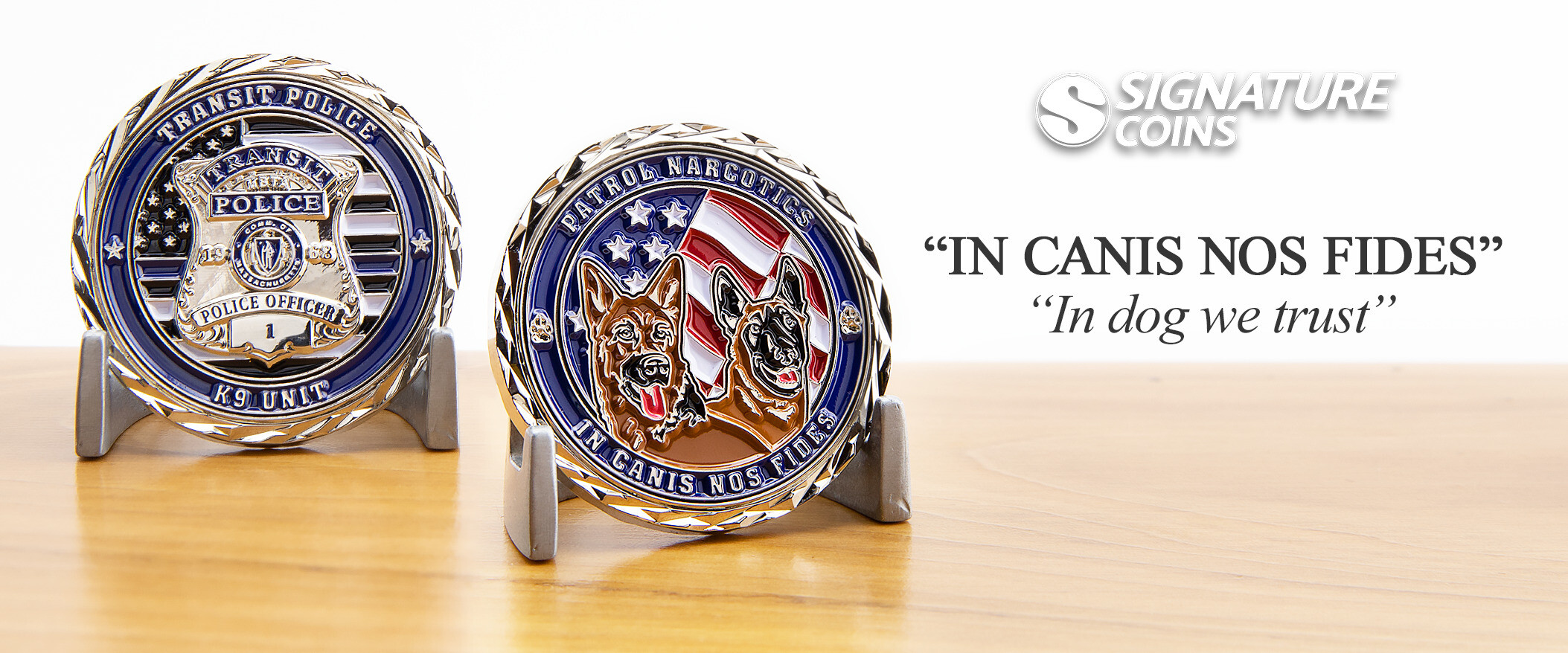 Finding the right Latin phrase all depends on what you want to accomplish with the design. Many of our customers are inspired by the mottos of their home state or their military units, and sometimes by bible verses or other religious sayings. Other times, they find unique ways of including inside jokes, personal references or hidden secrets with Latin phrases. This transit police challenge coin has its own version of the famous English phrase included on all US currency, In God We Trust. The Latin text printed underneath the portrait of the German Shepherds, In Canis Nos Fides, translates to in dog we trust.