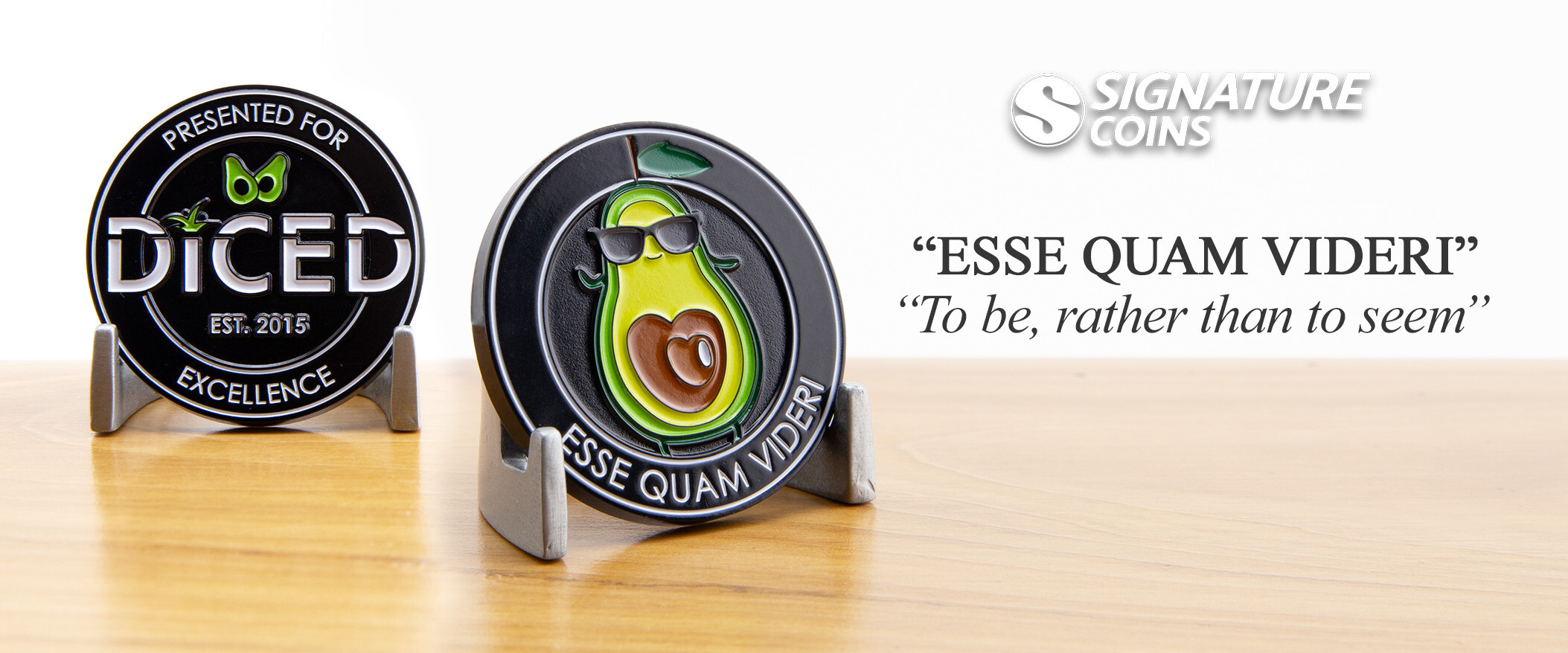 Including Latin on any style of challenge coin is a fun way to make the design unique. This custom coin created for Diced, a small business in North Carolina, has the phrase Esse Quam Videri printed beneath the little avocado guy on the back. It means to be, rather than to seem.