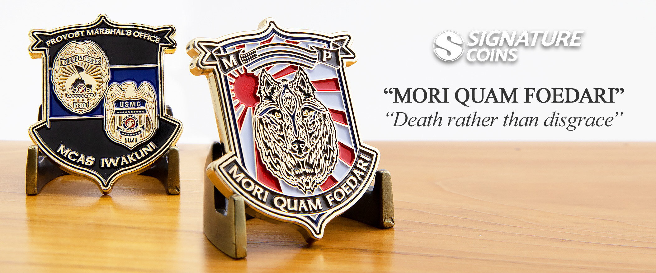 One of the most famous Latin mottos in the United States Military is the Marine Corps’ Semper Fidelis, meaning always faithful. Marines form unshakable bonds through training and service, and their motto, as well as their eagle and globe emblem, come to represent their connection to the long line of honorable service men and women in the Corps. Individual units of Marines have their own unique emblem and mottos, and sometimes these are chosen to create special unit coins. The Marines stationed at MCAS Iwakuni in Japan decided to include their own emblem and motto for their unit coins, instead of the traditional Marine Corps emblem.