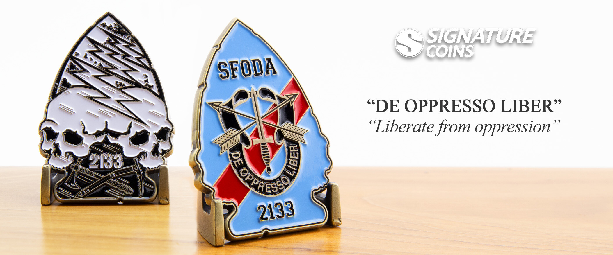 This arrowhead-shaped coin has the Army’s Special Forces emblem and Latin motto, De Oppresso Liber, pressed into the back of the design. It means to liberate from oppression and serves as a constant reminder of a special forces soldier’s mission. Like many custom unit coins throughout the military, this coin has a unique personality. The custom shape, unique artwork and complex coloring make it stand out from the crowd of military coins, but including the Special Forces insignia ensures there is a connection to all special forces teams in the Army.