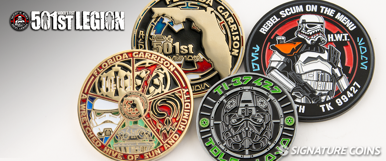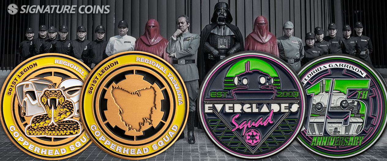 501st Legion challenge coins come in all different colors, shapes and sizes and are made for different purposes for different garrisons (local detachments) all over the world. Some are created to help fundraise for local charities, while others are personal coins traded between members of the Legion. The Legion itself is modeled off the structure of the United States Military, with garrisons, detachments and units dispersed all over the world, so if you are hoping to join, or maybe have a 501st appearance at your next event, odds are there is a garrison nearby.
