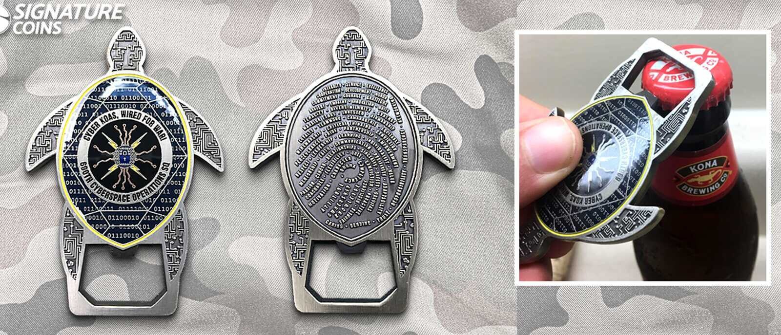 Here at Signature Coins, we pride ourselves on being the premiere challenge coin maker available online. When it comes to creating custom bottle openers, there’s limitless potential for what can be achieved in a design. Some of our customers prefer a more standard challenge coin bottle opener design while others create elaborate coins with functional bottle opener hooks hidden in plain sight. Before getting started on a set of coin bottle openers, it helps to know what style of coin design you think will work best for your own ideas.