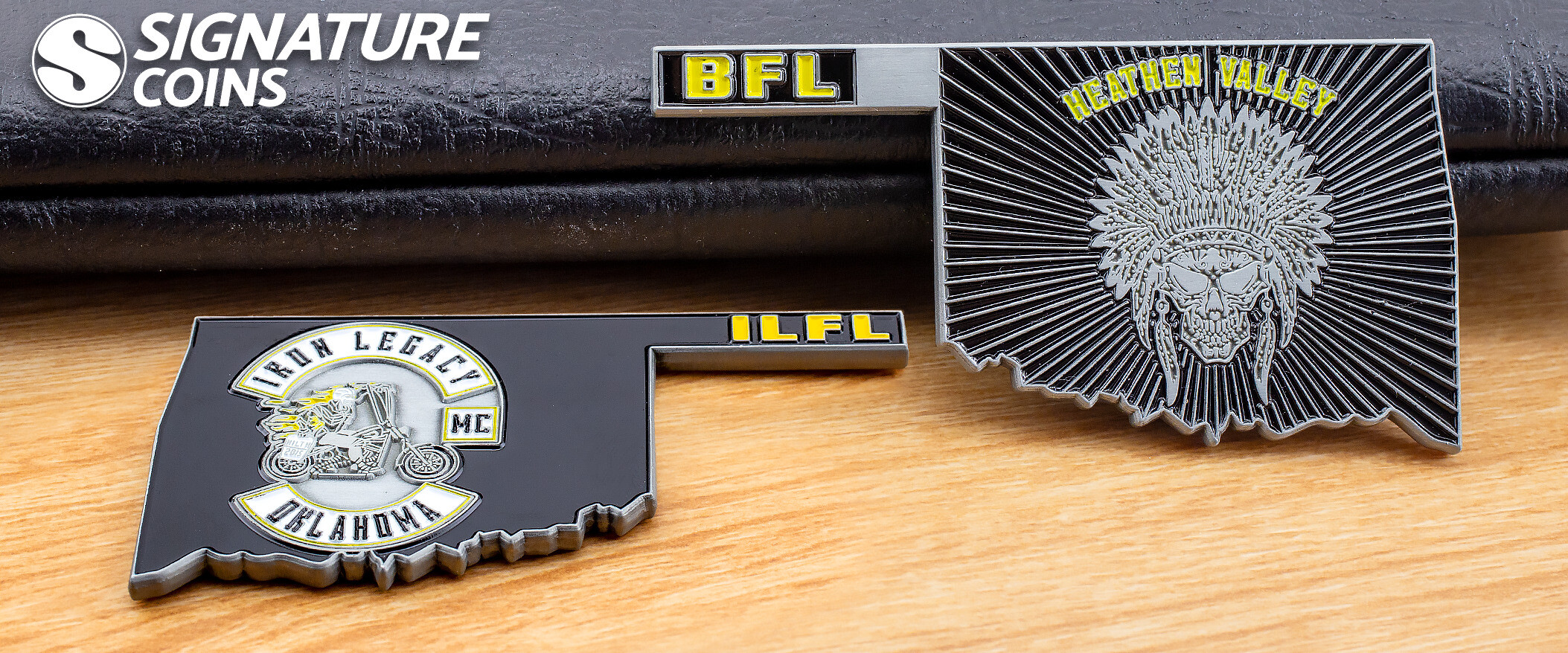 Oklahoma is another example of a state with a very recognizable shape. The Iron Legacy has chapters all over the world, and each one has its own way of making custom challenge coins for riders. Many of the designs make use of the Iron Legacy logo and the black and yellow color scheme, but each one has a unique twist. Not only does the Heathen Valley chapter of the club use the dynamic shape of their home state in the design, but they also incorporate their own skull emblem on the front of the coin.