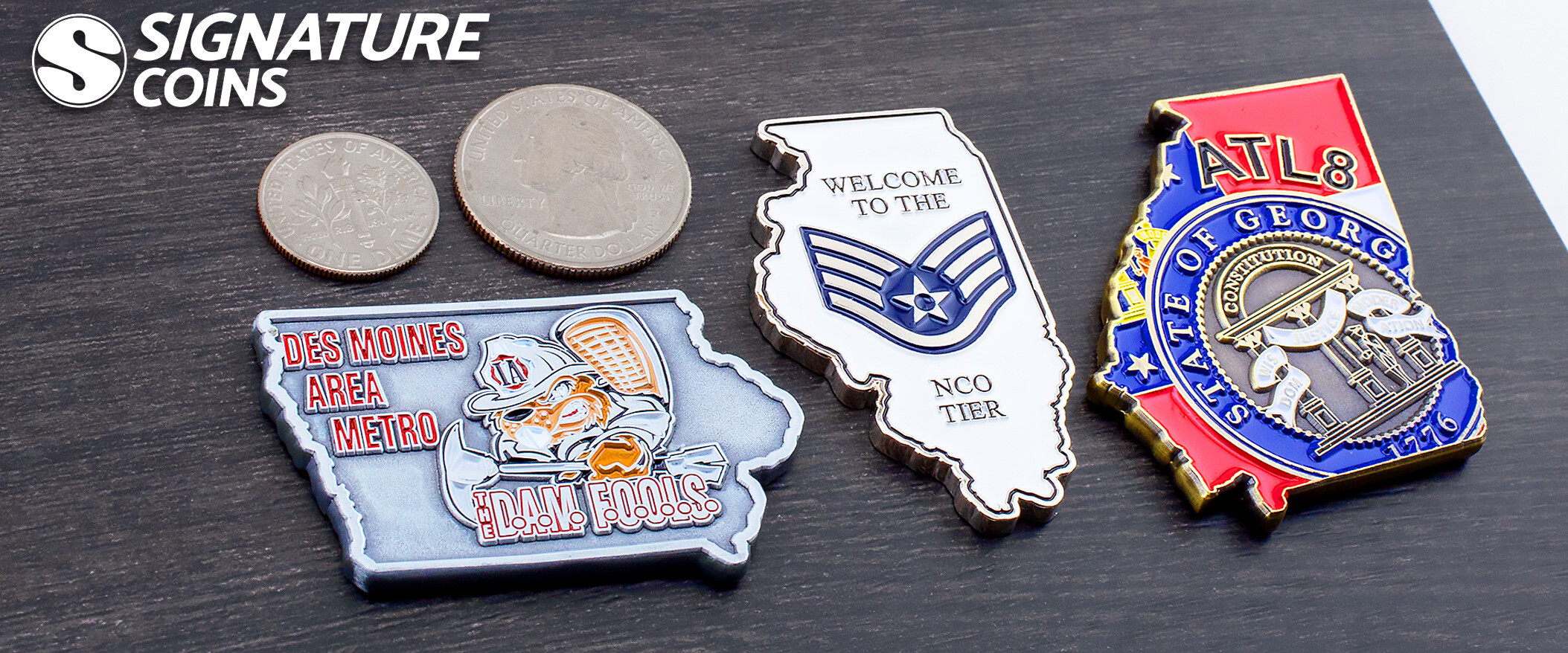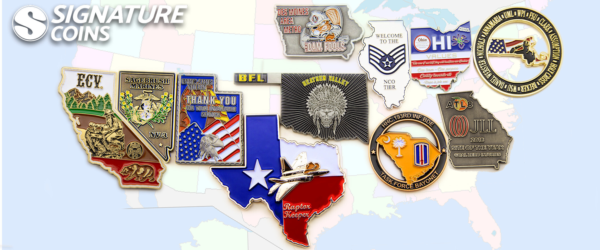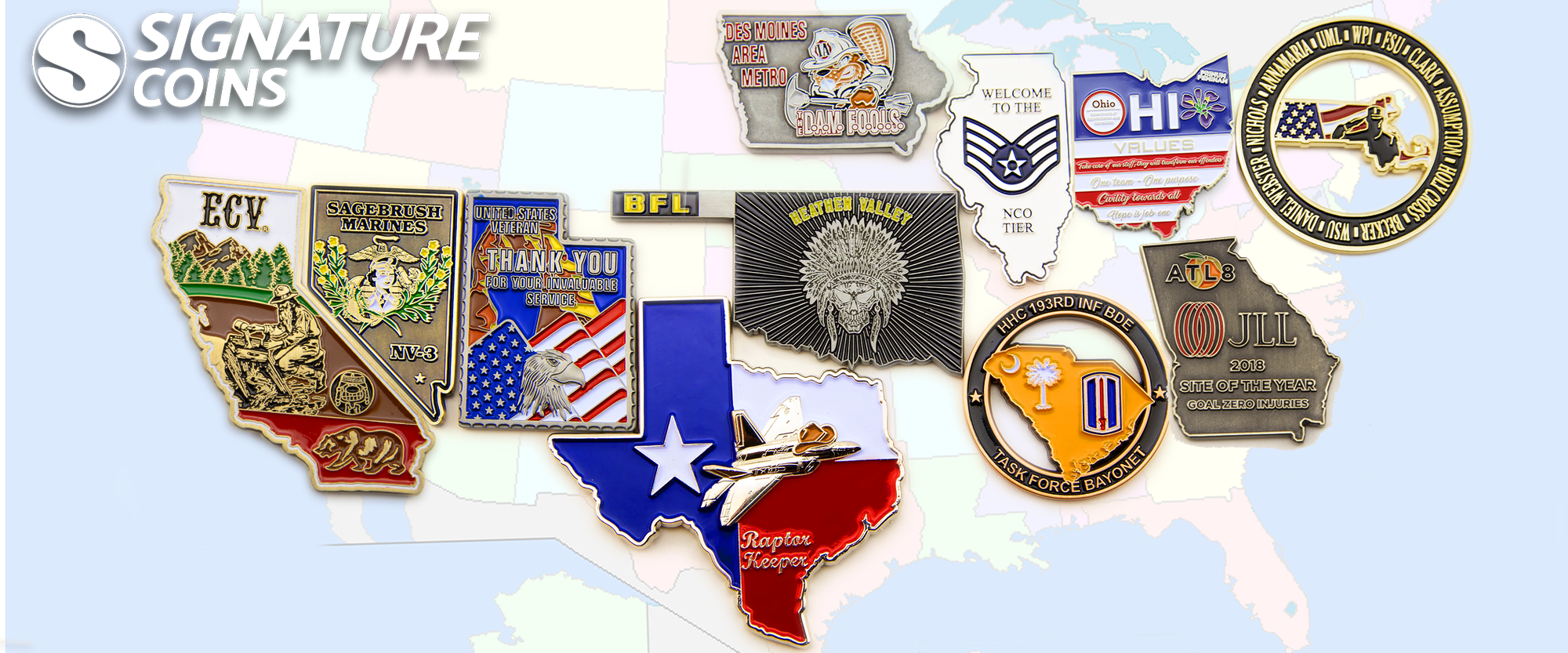 Our Signature Coins team has been in the challenge coin business for a long time, and we have been fortunate enough to work with clients from each and every one of these 50 United States. We’re proud, to say the least, of how far we have come as a small business based in Orlando, Florida, but there is still work to be done. You see, we may have delivered coins to all of the 50 states (and countries all over the world), but we have not yet managed to make custom coins shaped like every state.