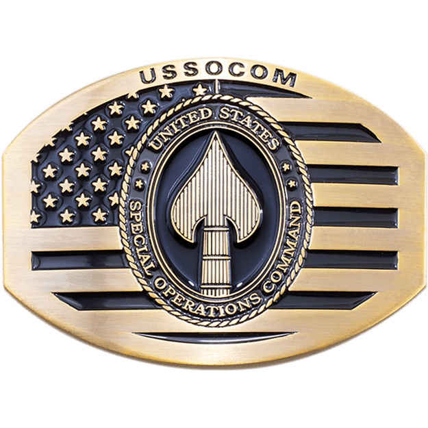 Custom box frame belt buckles are the most popular choice for soldiers because they’re required for military uniforms. No matter the branch of service, custom military belt buckles need to follow strict guidelines for size, shape and design. Box frame buckles attach to web belts using a hinge with teeth on one end that bite into the fabric of the belt. The belt itself slides into the box frame that’s secured to the back of the belt.