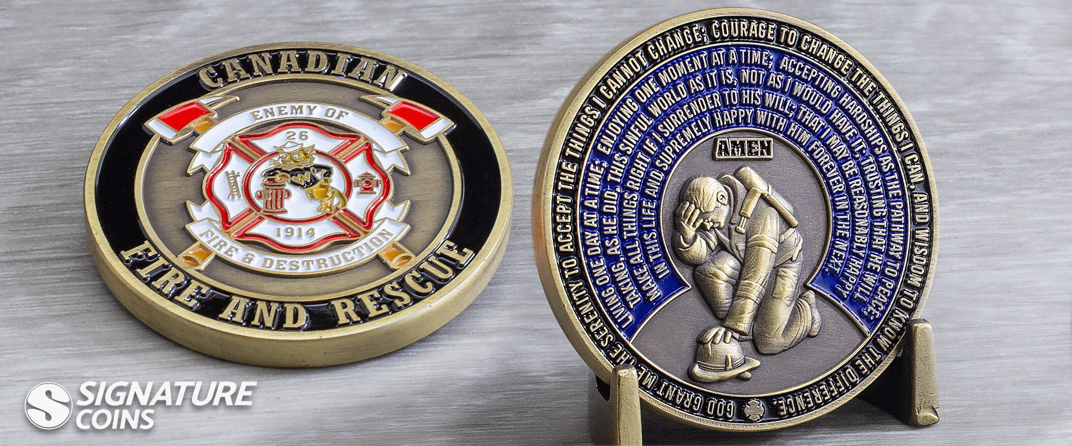 Custom prayer coins like these are a popular gift awarded to firefighters and police officers who put their lives on the line every day. The prayers themselves honor fallen brothers and sisters in the line of duty and ask that the carrier is protected from harm. This makes each coin a reminder of the dangers of service and the precautions that should be taken, as well as serve as a source of comfort.
