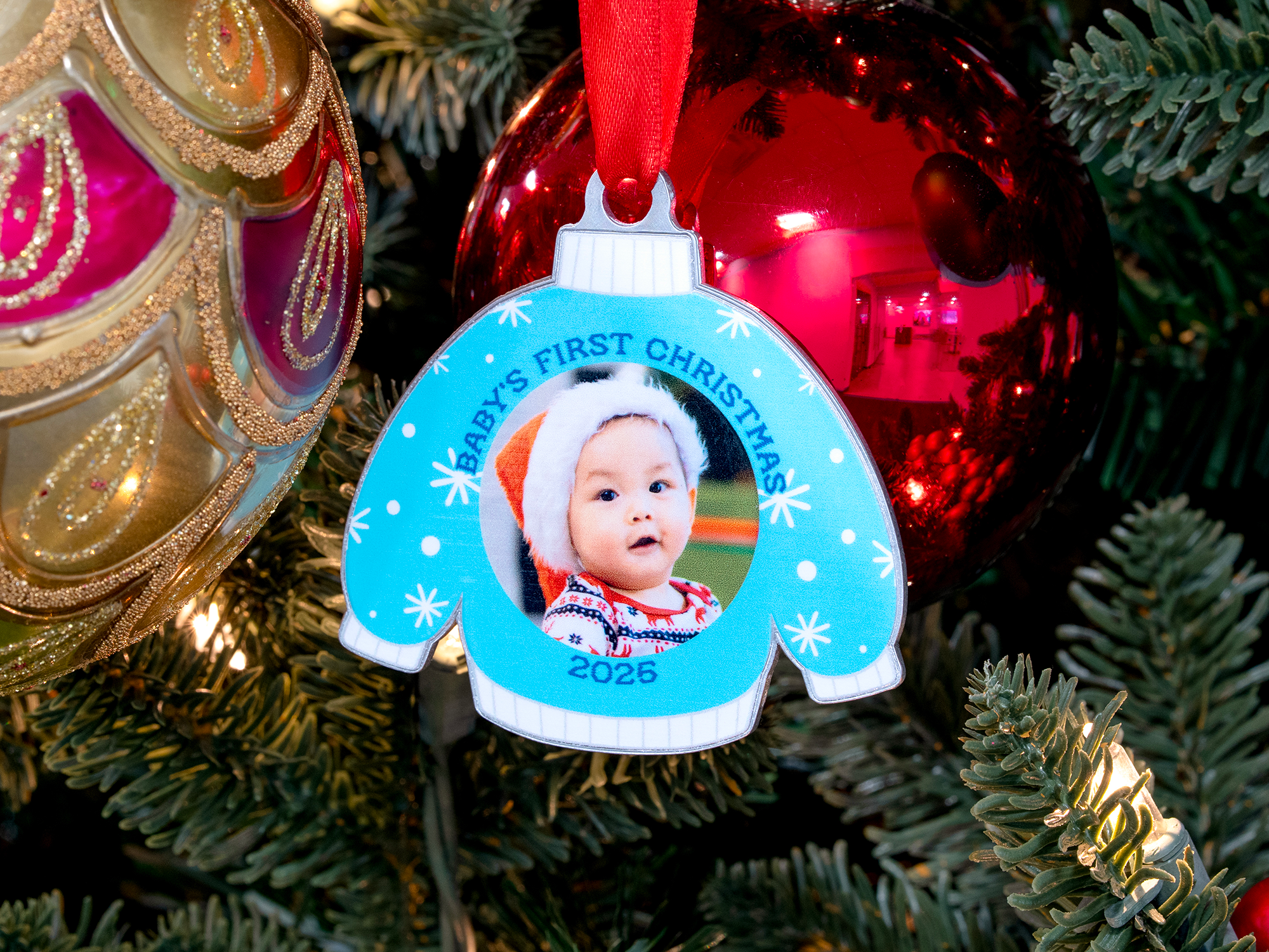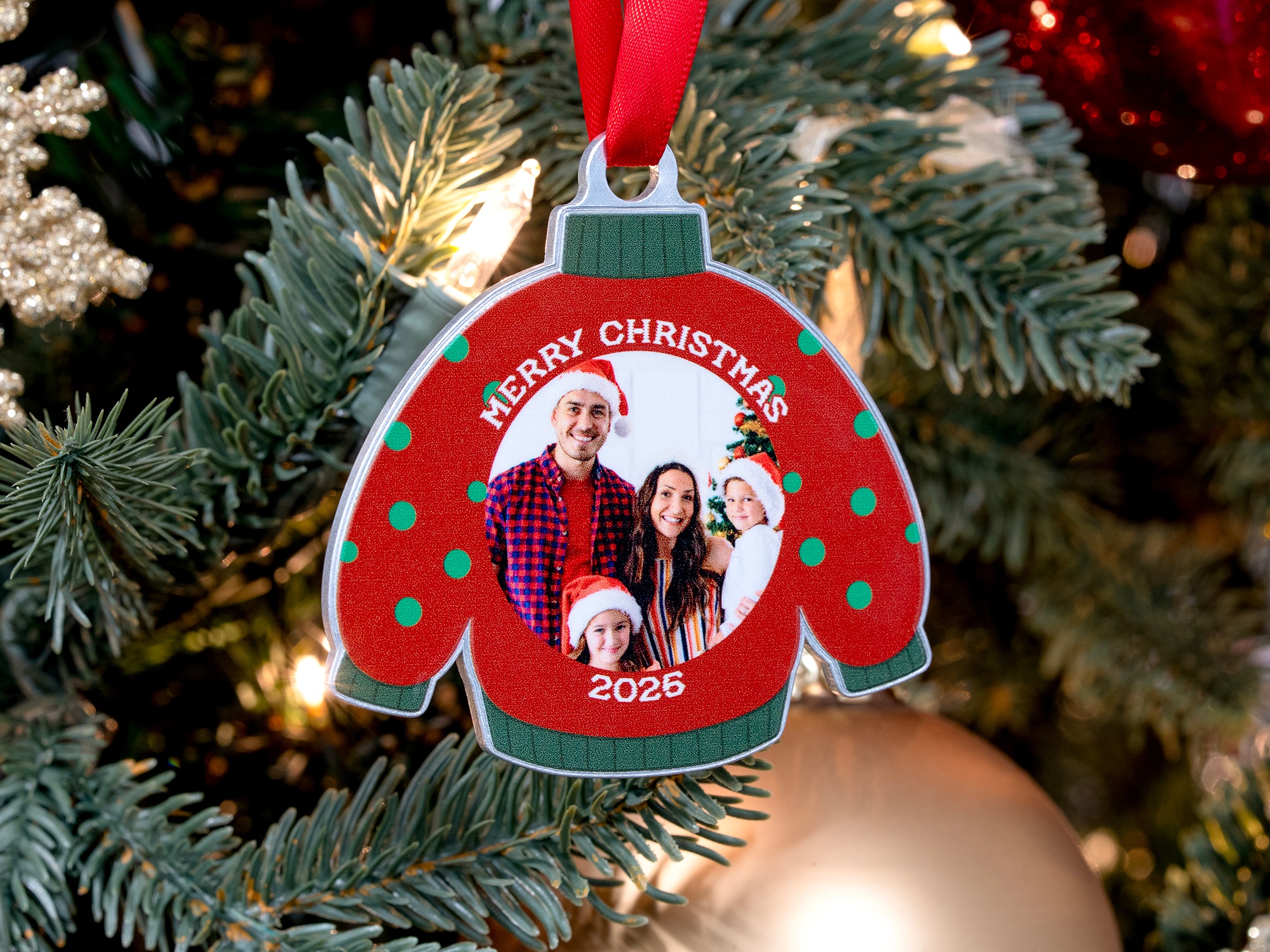Crafted for simple, standout customization, each 3-inch sweater-shaped ornament lets you upload your own photo, add custom text, choose your sweater colors, and select from a variety of holiday patterns. The result is a cheerful, one-of-a-kind piece that captures your favorite memories and moments.