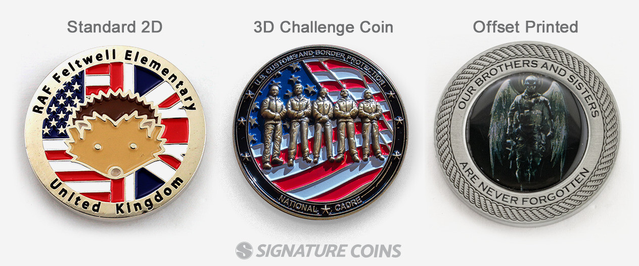 When a client can’t decide on just one of these styles, we tell them not to worry. It’s entirely possible to order a coin with 2D designs on one side and 3D designs on the other. Or you can have a coin made with both 2D and offset print designs. Especially when a customer has their heart set on a 3D design, choosing to mix and match these styles is a good way to save money on the final product. Deciding what style of challenge coin to make will have the greatest effect on your order, so make sure to check out some examples and get inspired before getting started.
