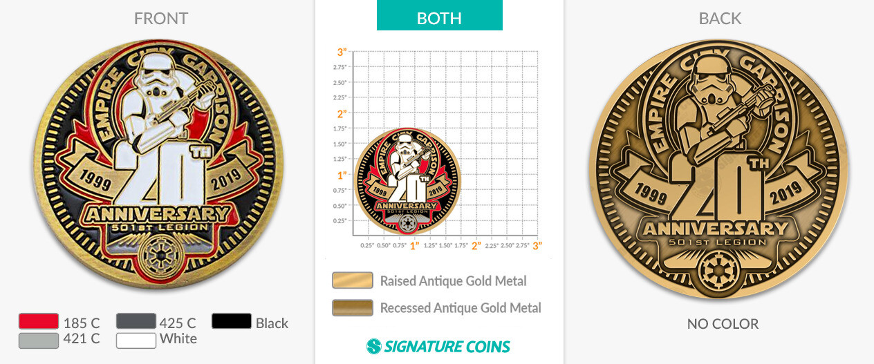 This 501st coin cleverly differentiates the front from the back with the use of color on the obverse and just the plating on the reverse. The effect is such that you almost forget that it’s the same design on both sides, and it really shows the unique difference between a coin with colorfill and a coin with just plating.