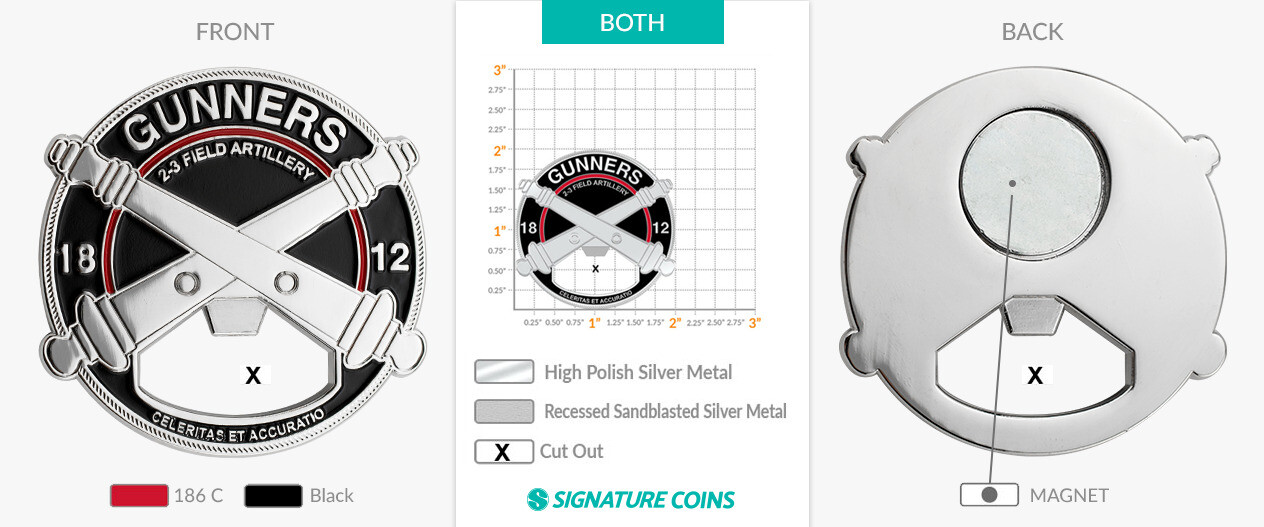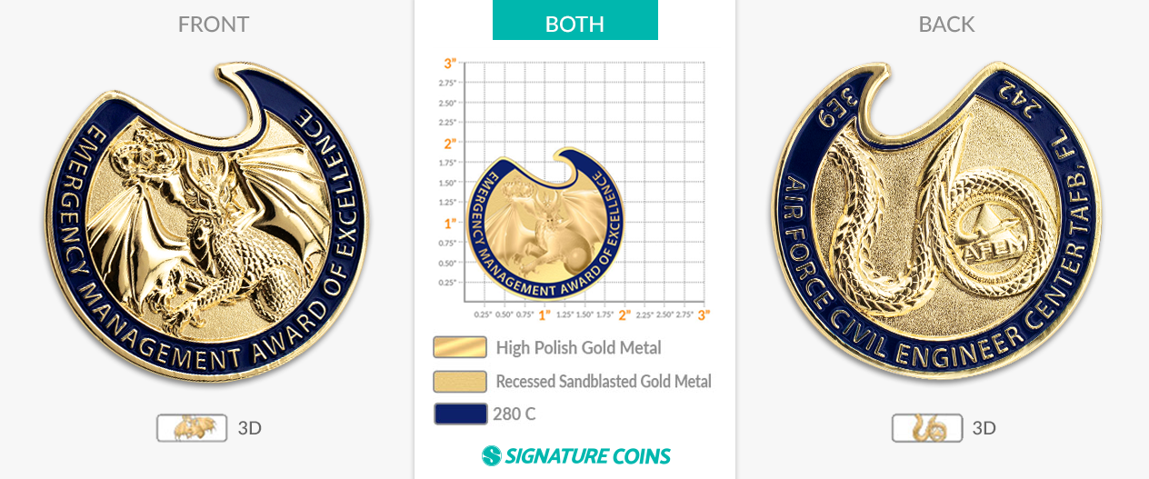 One of the more fun design options some of our customers utilize is to take the design and the artwork from the front of the coin and continue it around to the back. In certain cases, like this bottle opener coin for the Air Force, the results can be striking and powerful.
