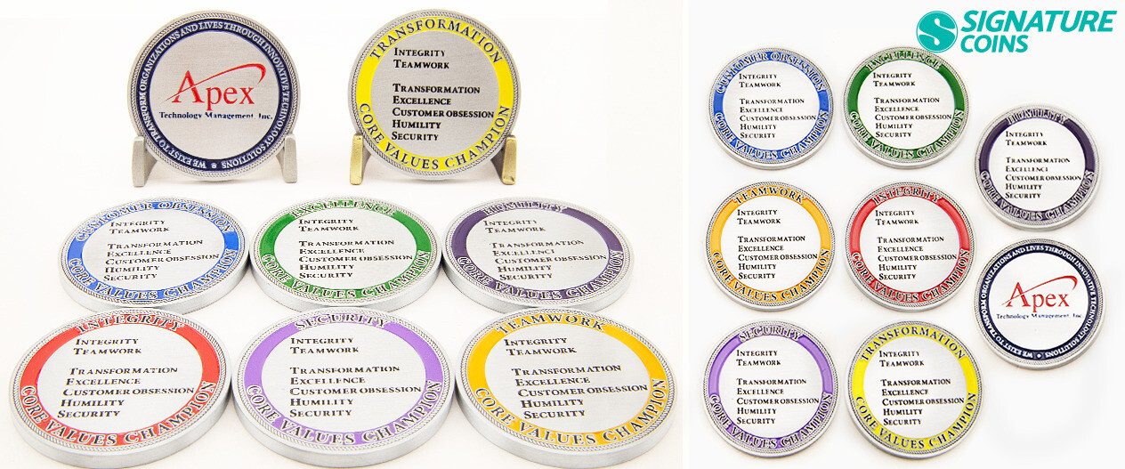 Core values are one of the most popular things to focus on when designing employee recognition coins. Companies like Apex use their brand logo on the front of their coins and while the reverse side of each coin represents a different core value in the company.
