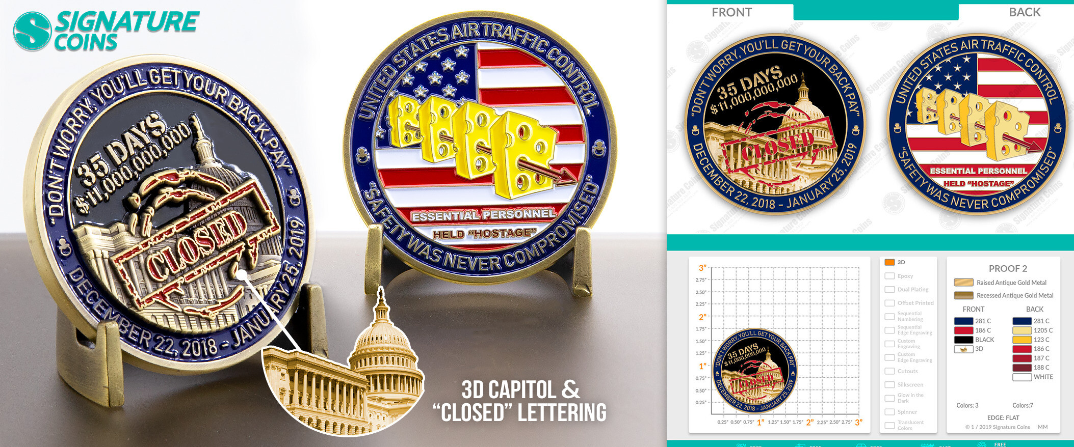 There wasn’t much to laugh at during the extended government shutdown. In particular, you would be hard-pressed to find a government employee, unsure of where their next paycheck would come from, who was laughing at the situation. With a little distance and time, these coins were ordered by the National Air Traffic Controllers Association. Saying that Essential Personnel were held “hostage” is a fun and tongue-in-cheek way to look back at what happened during the closure.