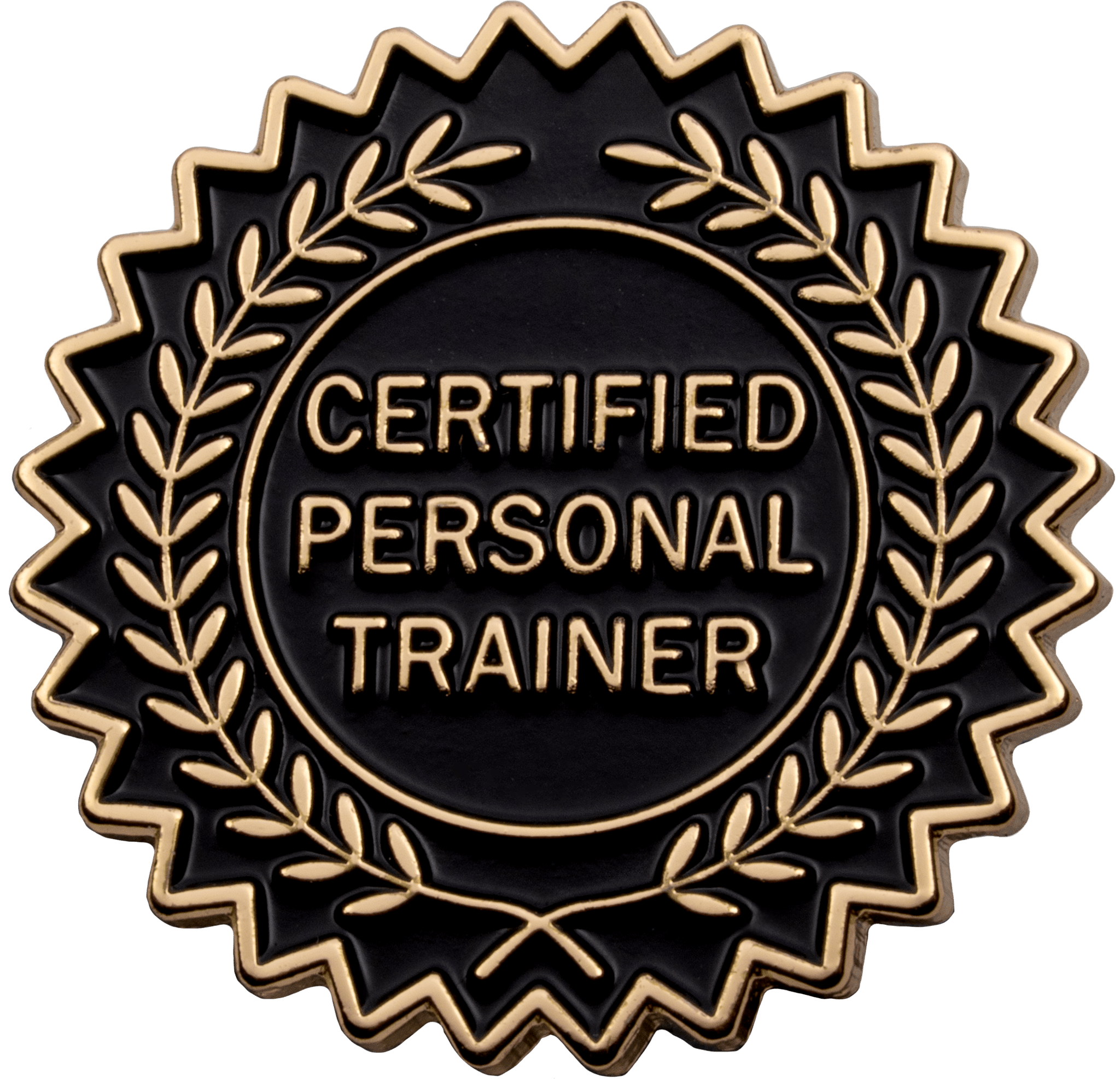 Gold and black lapel pin featuring 'Certified Personal Trainer' text surrounded by a laurel wreath and sunburst edge.