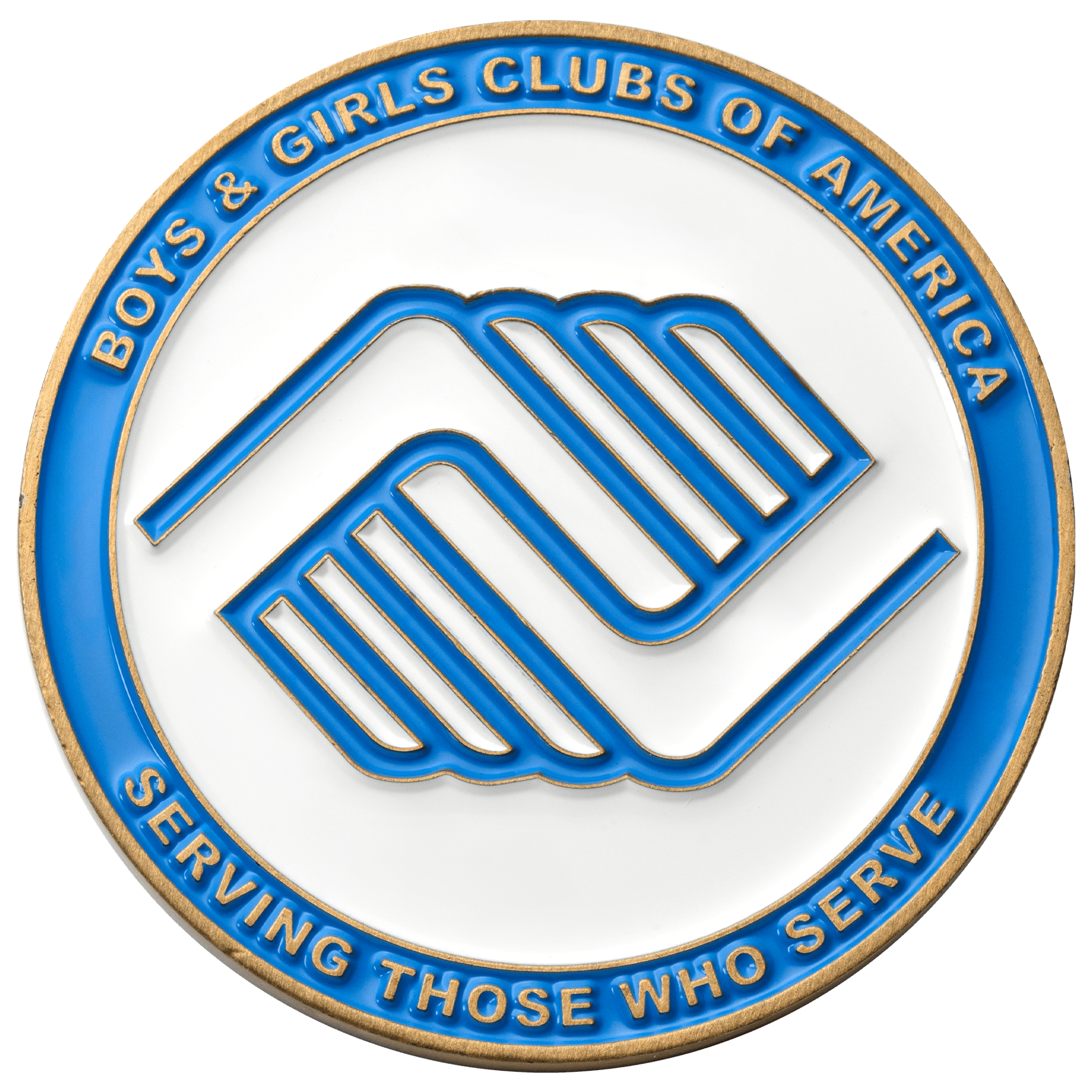 Circular Boys & Girls Clubs of America challenge coin with blue and white enamel and a gold border.