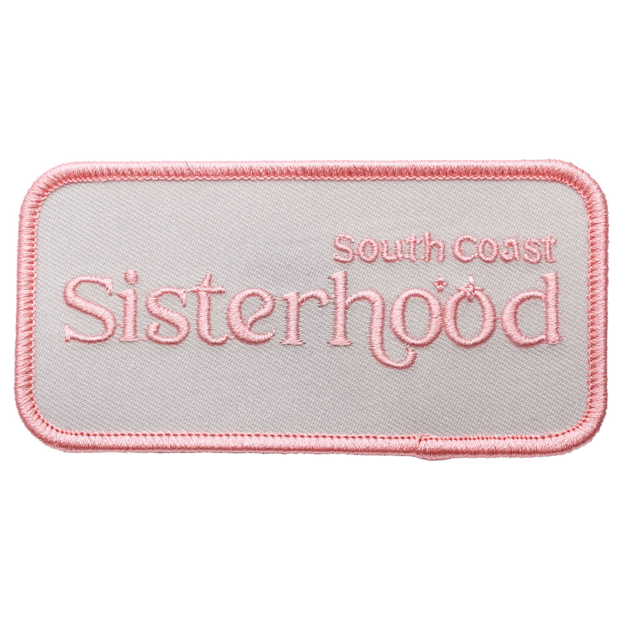 Rectangular embroidered patch with South Coast Sisterhood text in pink thread on a light grey background with a pink merrowed border.