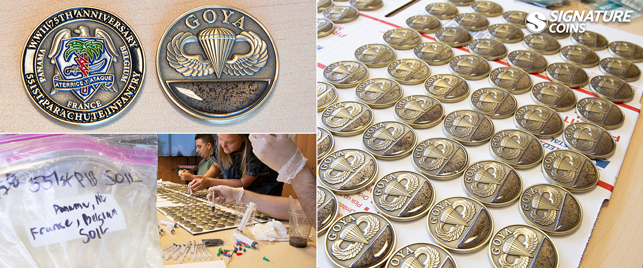 We shifted to Plan B and had our production facility create the coins and deliver them to our offices. At which point, our sales team took their time mixing the soil with epoxy and carefully adding the mixture to the proper spot on the coins. In the end, all 300 of the coins were completed to the customer’s specifications and shipped.