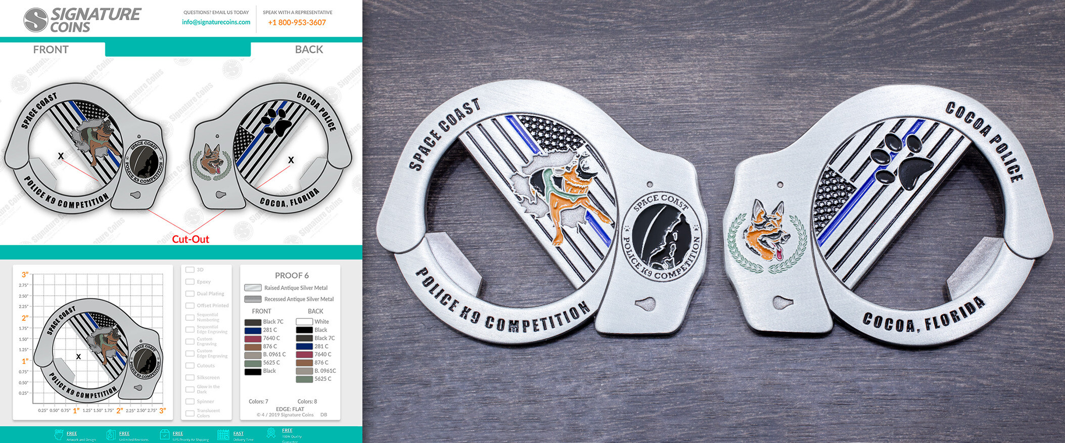 The Cocoa Police Department located just down the highway from our Signature Coins office made another set of handcuff bottle openers with their own spin on the design. Like the first handcuff shaped coin we helped create, the emblems on the key and chain section is different on either side. Since they were designed for the Space Coast Police K9 Competition, the team found their own way of changing up the Thin Blue Line American flag, including a paw print on one side and German Shepherd police dog on the other.