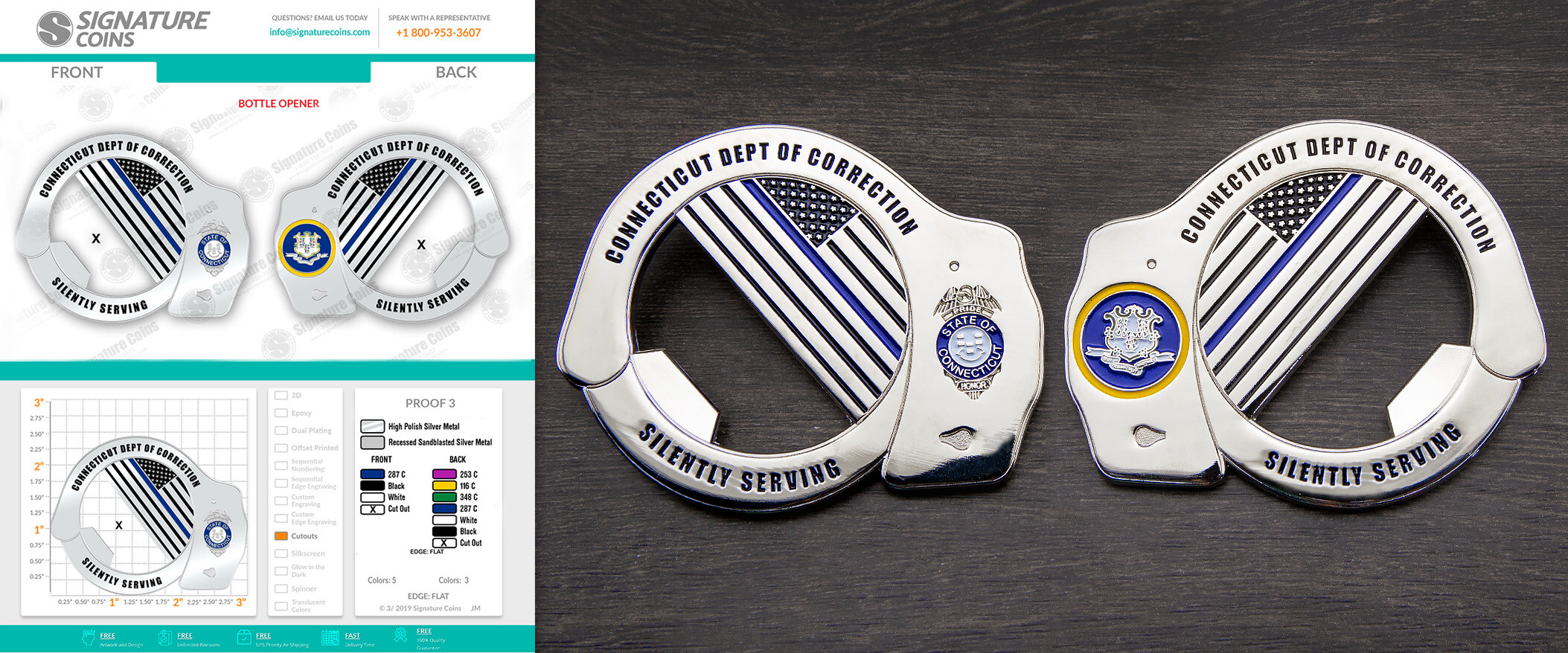 The Connecticut Department of Corrections was the first group to contact us about creating a unique handcuff bottle opener design. The officers wanted something that would stand out in their collection of challenge coins, and creating a design shaped like the handcuffs they use every day was a fun idea that translated perfectly into a physical coin.