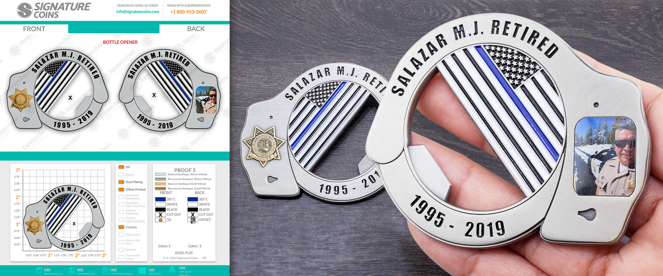 No matter what style of handcuff design you need or what kind of artwork you would like to include, our Signature Coins team has got you covered. All of these examples make use of the thin blue line American Flag, but there is plenty of room to incorporate different designs and unique artwork. If you have an idea for your own custom handcuff bottle opener challenge coins, let us know! Our team is ready to bring your vision to life!