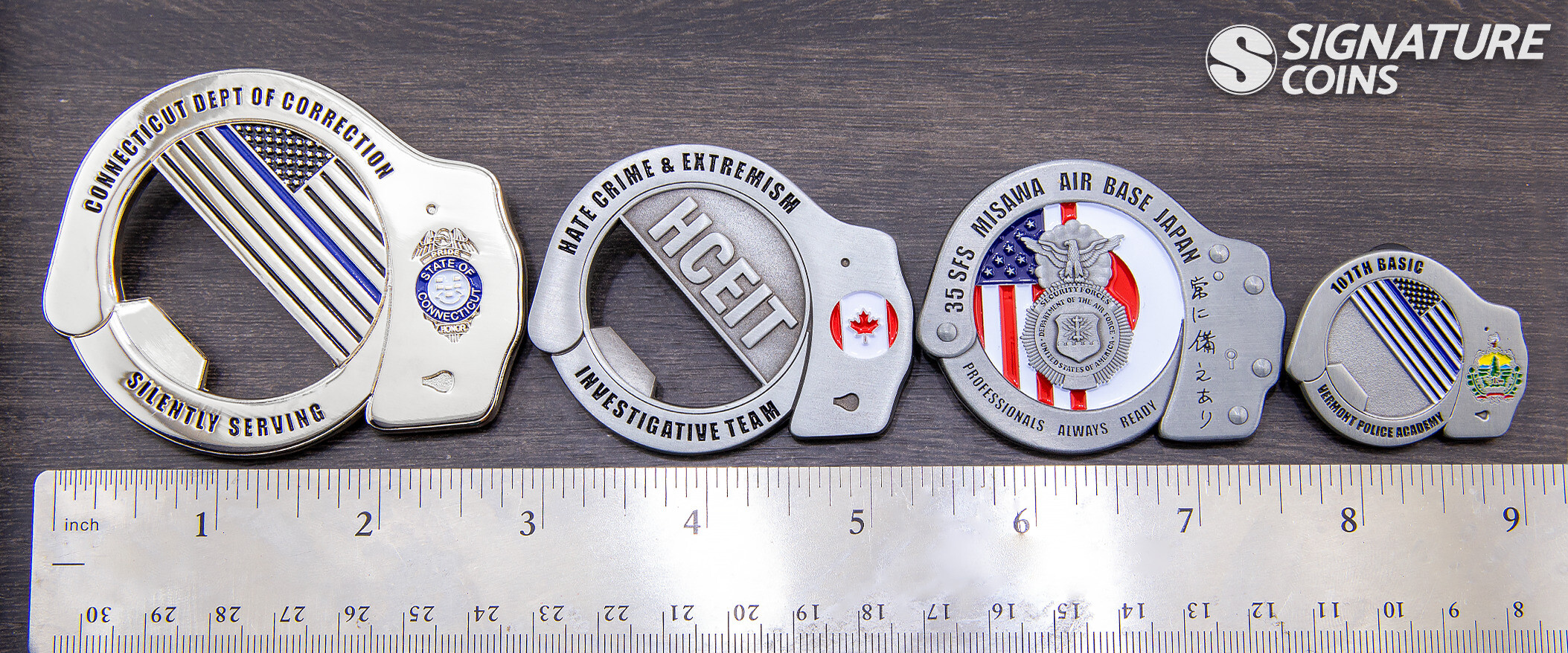 Not all of the handcuff shaped challenge coins we help design have a bottle opener cutout. Creating a functional bottle opener requires a larger size to accommodate the cutout portion of the design. For customers looking for a more average sized challenge coin, the familiar handcuff shape is still perfect for creating a unique cut to shape challenge coin.