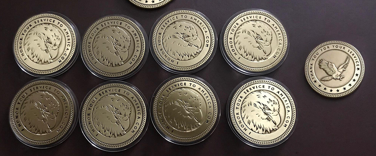 These challenge coins are for an online charity called I Honor Your Service To America. The group collects donations and creates special care packages filled with some of the comforts of home like snacks, toiletries, movies, books, writing materials, music and even girl scout cookies. Stateside veterans in need receive similar care packages with the essential items they might need while living in shelters or on the streets.