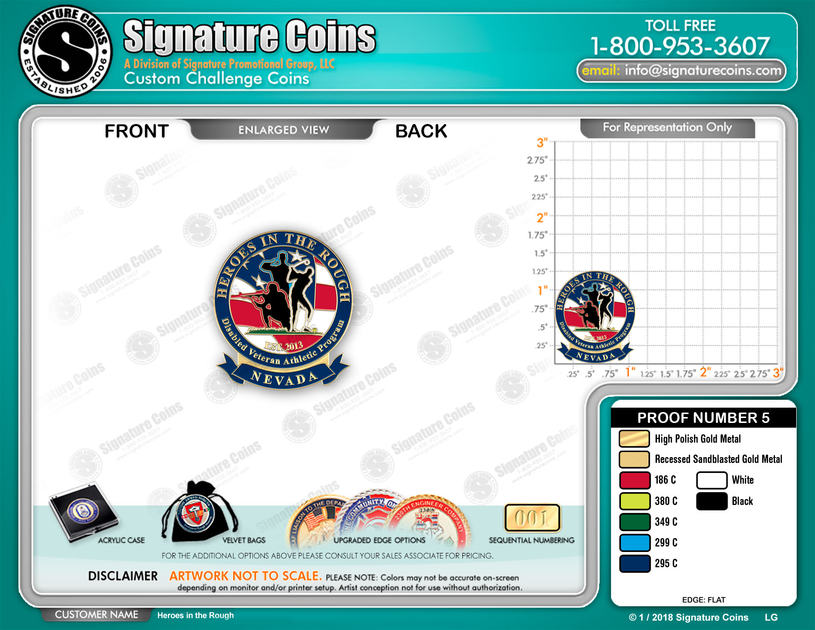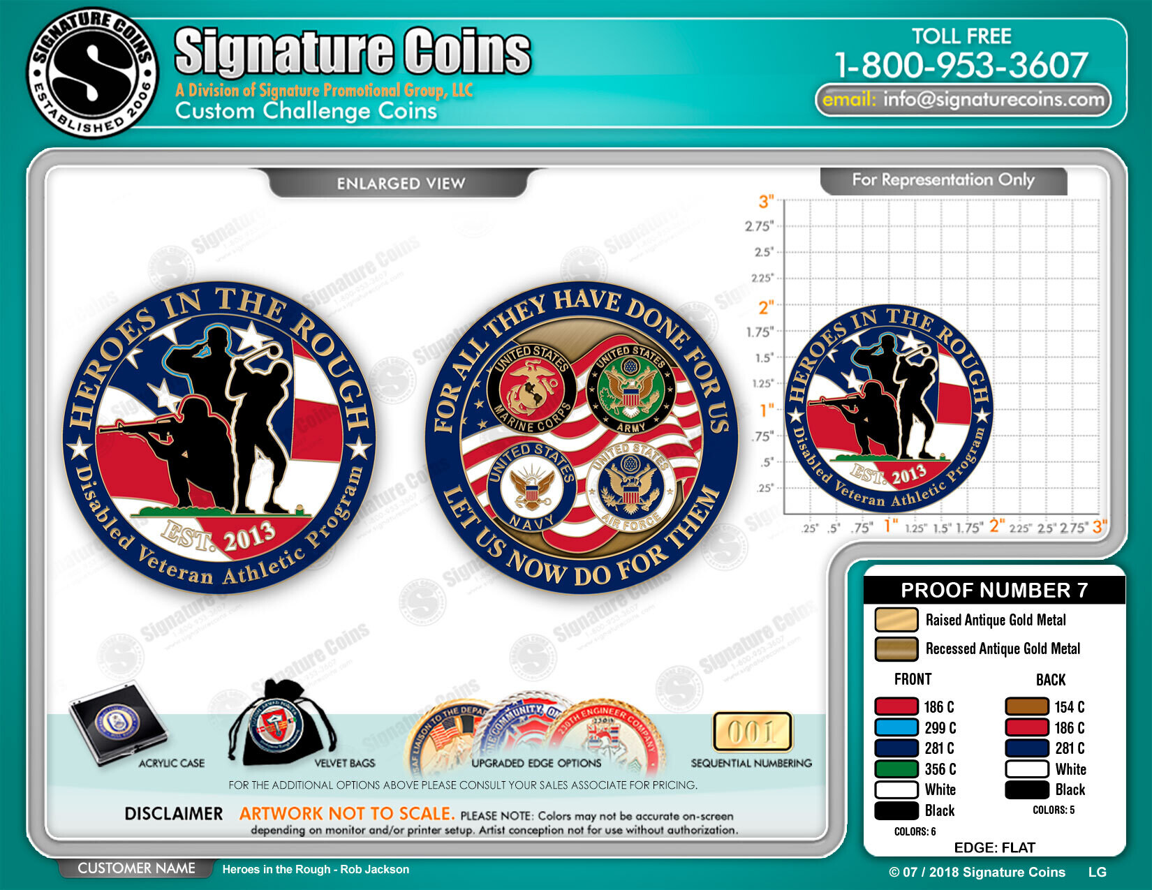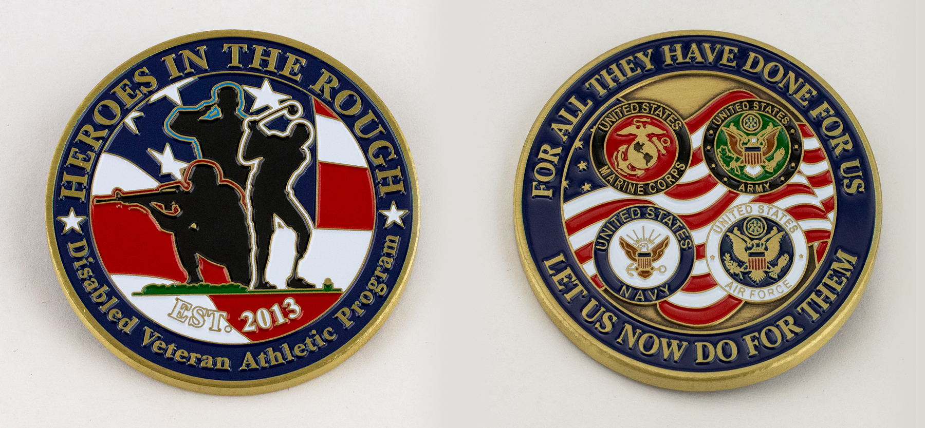 He said that others were amazed at the fine detail on such a small coin, and believes this is the big reason they were such a success in fundraising and promotional efforts. Because Heroes in the Rough is run entirely by volunteers (no one receives a salary from the president all the way down), they rely on donations and sponsorship to continue their services. The patches, lapel pins, golf ball markers and challenge coins that they order from Signature Coins are given out for donations that support the cause and as tokens of membership for the people taking part in Heroes in the Rough programs.