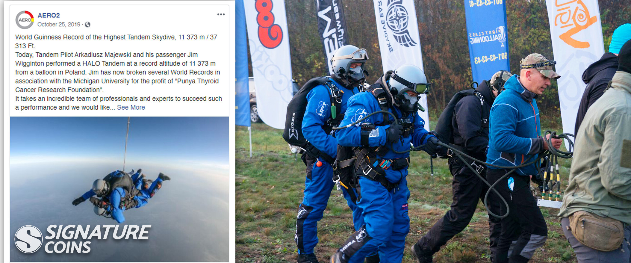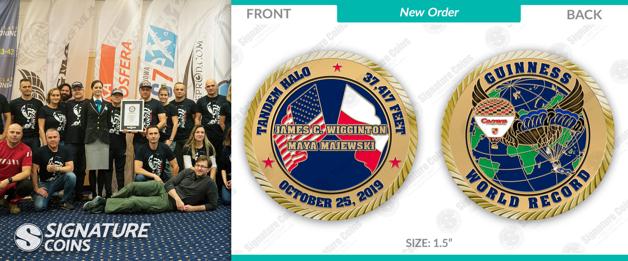 Both Wigginton and Maya’s full names are printed on the coins, honoring the world record the pair set together. On the back of the coins, the design of the actual balloon that carried them more than 37,000 feet in the air is included beside a depiction of the two men under the parachute canopy on their way back down to earth.