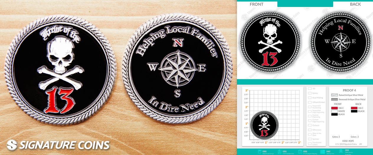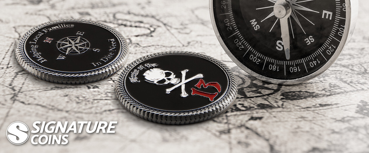 Reflecting on the charity, Captain Roger said, “Four years ago, there were only 13 of us.” The custom coins he designed for his crew are a reflection of how much the organization has grown in that short amount of time. Today, they’re over 50 crewmates strong and on a steady course ahead. Like many of the nonprofit challenge coins we help create, Captain Roger wanted his crews’ coins to symbolize their mission and values. With their jolly roger emblem stamped into each coin, members are able to spread their message with all the people they meet, while also spreading a little pirate love in the process.