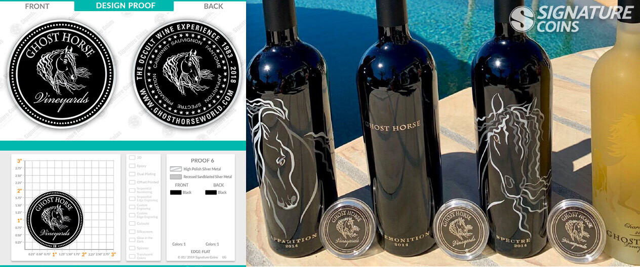 Another customer of ours who designed a set of branded challenge coins is Todd Anderson, the owner of Ghost Horse Vineyards. The black and silver horse design pressed into his coins is used on all the bottles that come out of his winery. Anderson carries at least one of these coins around at all times so he has something to give to the people buying his wine. Each coin has his personal phone number included somewhere in the artwork so anyone carrying a Ghost Horse coin can get in contact with Anderson at any time.