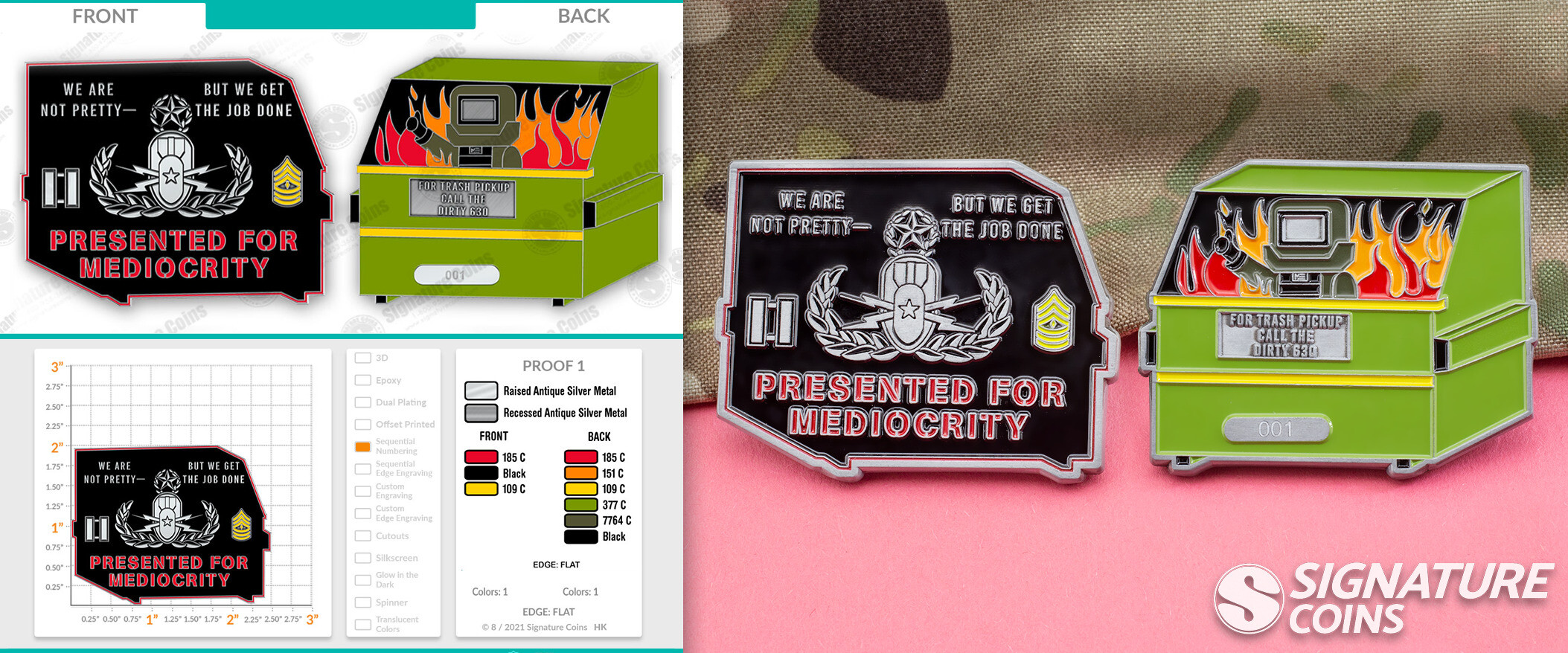 These “Dirty 630” coins are just one example of the funny coins we have helped design that show off a group’s particular sense of humor. Soldiers make unit coins like this because they want to celebrate what makes them different from all the other teams of soldiers. While they will always be loyal to the corps, creating a unique brand for themselves helps a team stand out from the crowd.