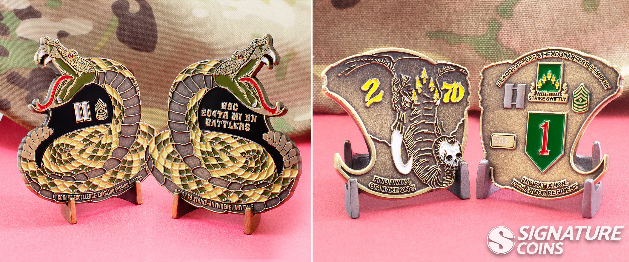 These bottle opener coins take inspiration from the nicknames and mascots used by individual companies, and each design incorporates a unique motto. For the “Rattlers” of the 204th Military Intelligence Battalion, the motto Ready to Strike — Anywhere, Anytime is perfectly captured in the coiled rattlesnake design of their unit coins. The Elephant design of the Headquarters & Headquarters company of the 2nd Battalion, 70th Armor Regiment is meant to call to mind how the team represents an unstoppable force. Their motto, Find a Way, Or Make One, is pressed into the design, just under the massive tusks of the bull elephant.