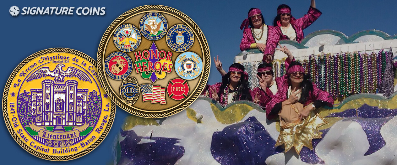 These custom coins were made to celebrate the annual parade that takes place every February a few weeks before the actual day of Mardi Gras. Specifically, these coins were created for the veterans, law enforcement personnel and first responders involved with the parade. Since challenge coins are such a famous tradition among soldiers, police officers and firefighters, the Krewe Mystique thought these Mardi Gras inspired coins would be the perfect way to say a meaningful thank you for all of their service to our nation.