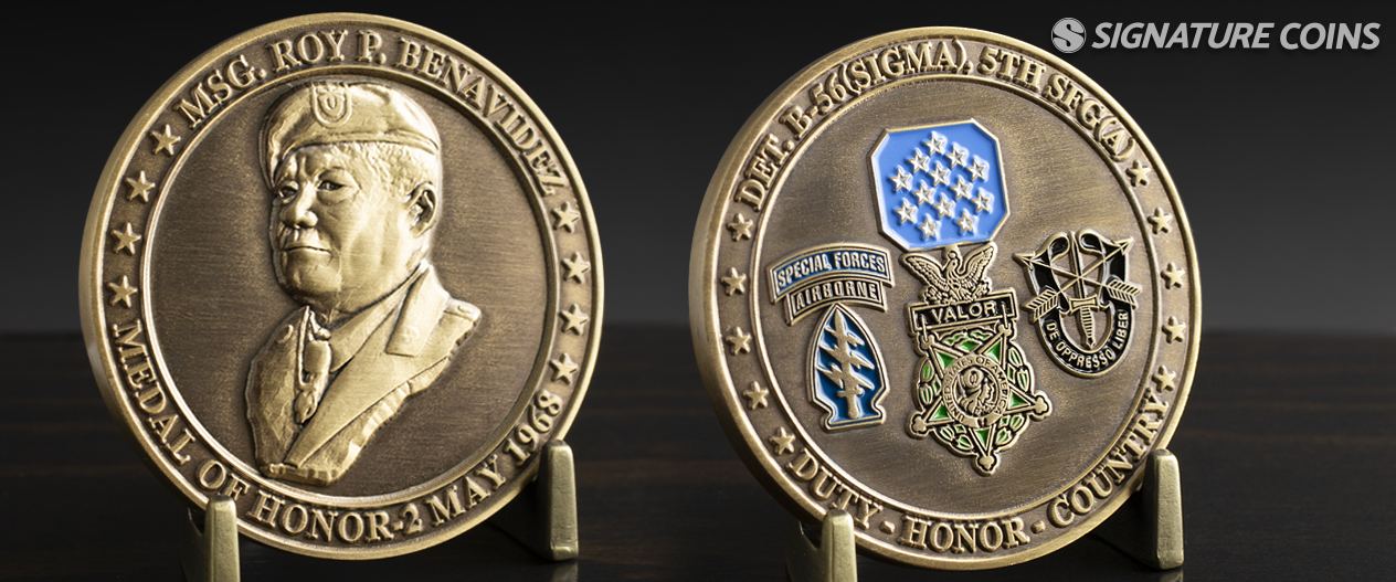 Challenge coins are not as formal as the military medals listed thus far. Celebrations like the Airman’s Coin at the end of Air Force basic training use challenge coins in ceremonial fashion, however, custom coins are usually much more personal. Military leaders mint coins for the soldiers in their command and hand them out to recognize excellent service and to foster a sense of camaraderie among the ranks.