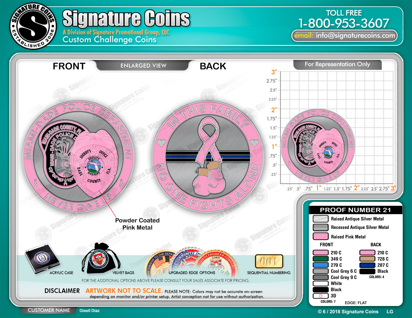 Based in Orlando, FL, Signature Coins has worked long and hard over the years to become an industry leader in the design and production of high-quality challenge coins. Recently, we were proud to provide our services to the Miami-Dade Police Department (MDPD) Hammocks District to produce 630 bright pink challenge coins for their district in honor of October 2018’s Breast Cancer Awareness Month.