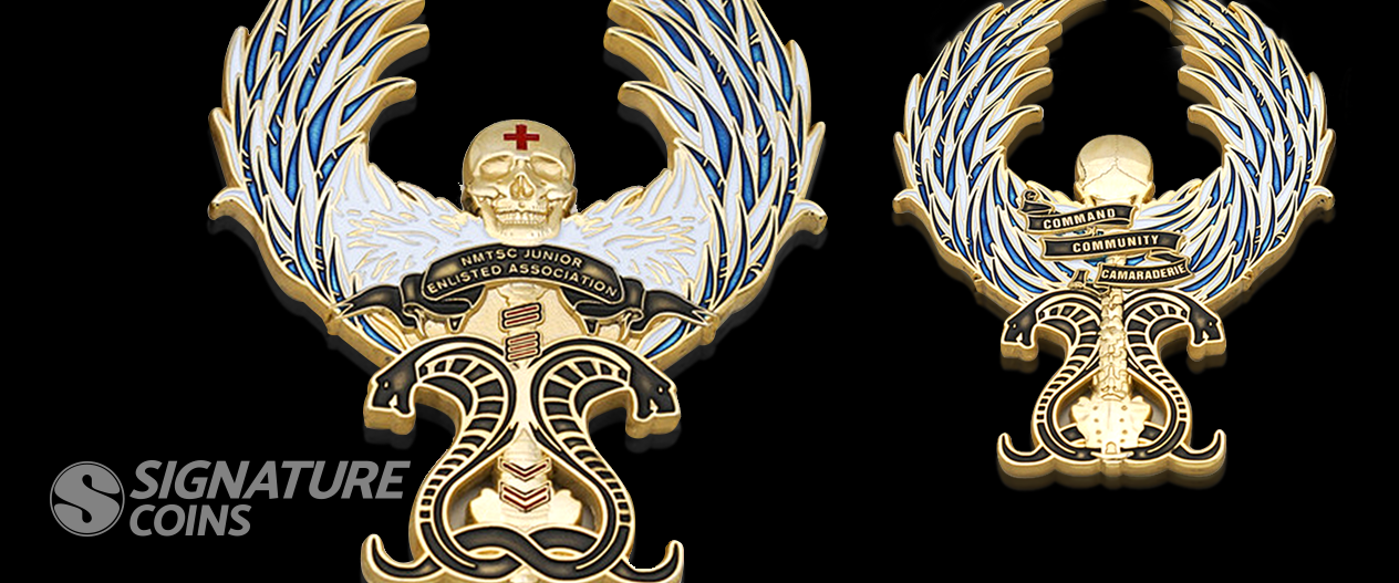 Challenge coins are like memories shared by a team. You hand them out, and they are forever a symbol of what a group has learned and accomplished together. What makes working with Rucker and the Naval Medicine Training Support Center (NMTSC) so special is that it always gives us the chance to stretch our legs and test our creativity. As partners, we have made some incredibly unique coins and custom products that push the limits of what is possible in challenge coin design. One of our absolute favorites is this double winged insignia for the center.