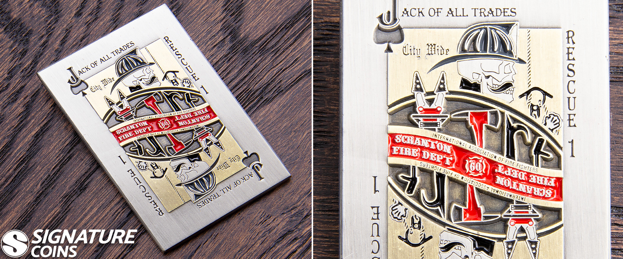 These are firefighter challenge coins, not military unit coins like the others. Specifically, they’re created for members of the Scranton Fire Department. Like a true Jack of Spades, the design is mirrored. No matter which way is facing up, you’ll still be able to make out the intricate design of the right-facing fireman and his hooks, ax and cutters.