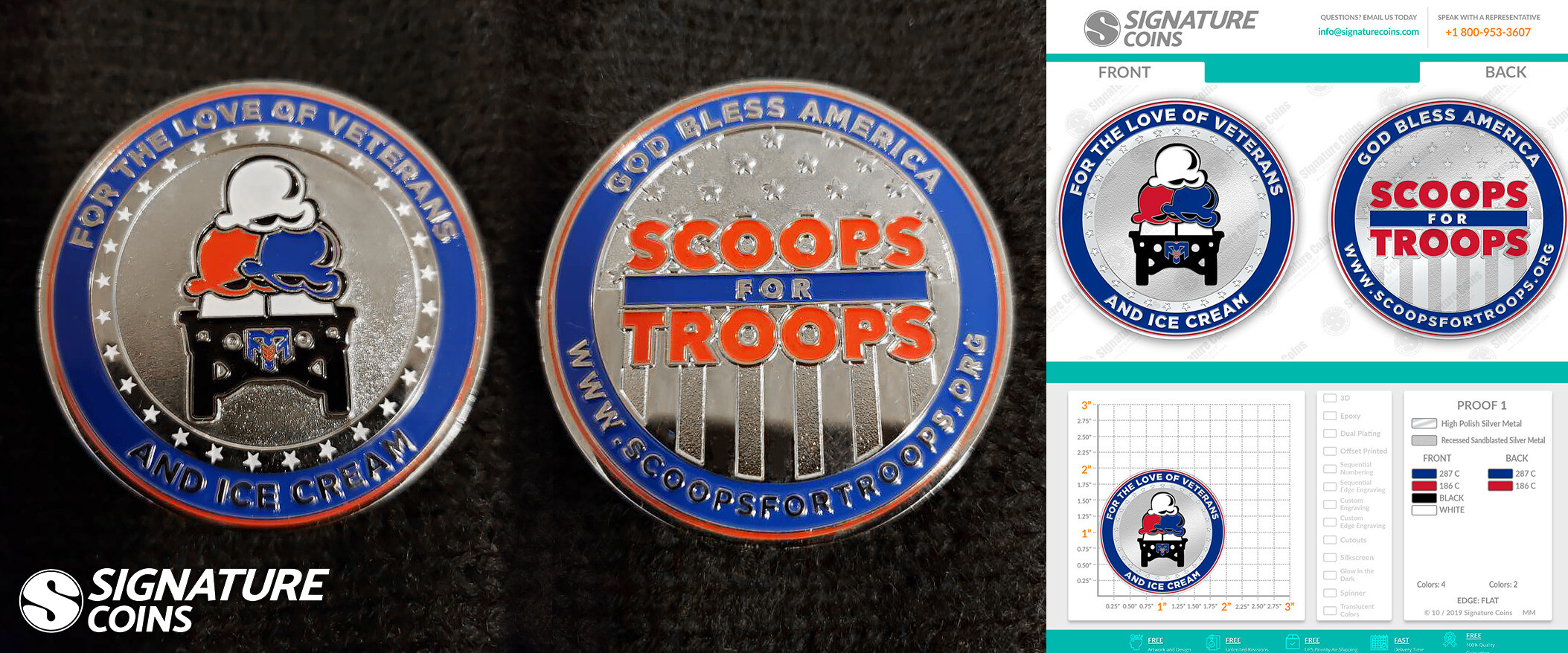 Over the years, we’ve been honored to help several organizations design special Veterans Day challenge coins that celebrate service and honor a soldier’s sacrifice, and this year, one specific organization caught our eye: Scoops for Troops.
