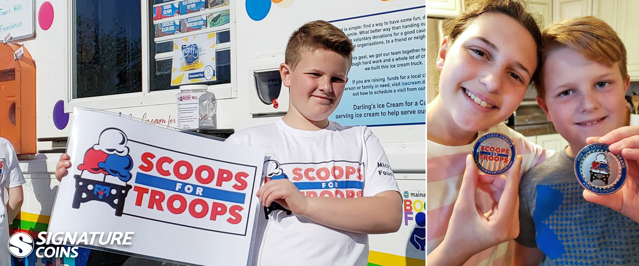 Here at Signature Coins, the first we heard about Scoops for Troops was through an email sent to us by Michael and his father. “We reached out to Signature because we love challenge coins,” said Ahern. He and Michael asked if we would consider donating a few coins from our stock to Scoops for Troops. They wanted to use them as raffle items in their upcoming Veterans Day event.