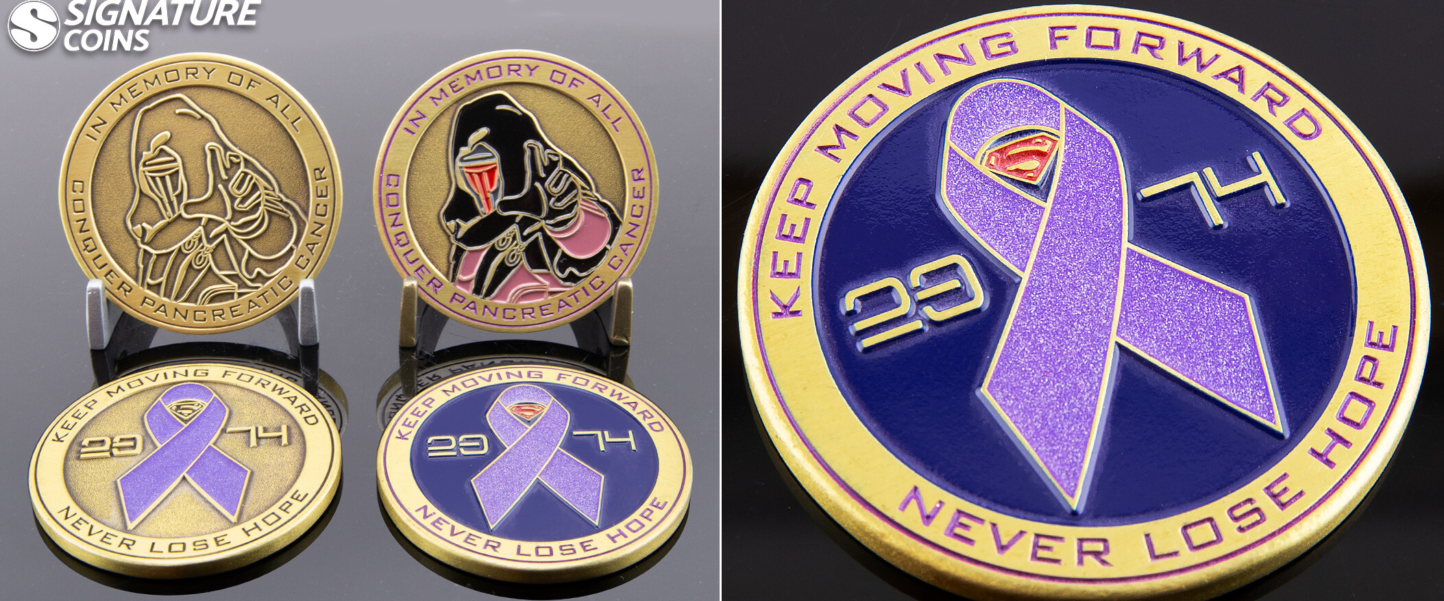 In the bare metal gold and silver coins, the text around the edge and the details of the Sith Lord character are easy to appreciate. In the full-color versions, however, the added color breathes a stronger sense of life into the artwork and helps the text stand out even more. The incredibly small colorfill areas where purple enamel was added to the words “In Memory of All” and “Conquer Pancreatic Cancer” perfectly show how color, even in the smallest places, can make a huge impact and draw the eye to certain parts of a design.
