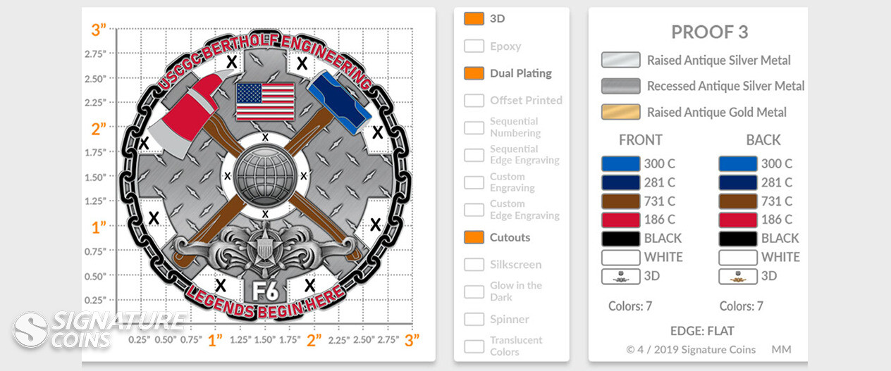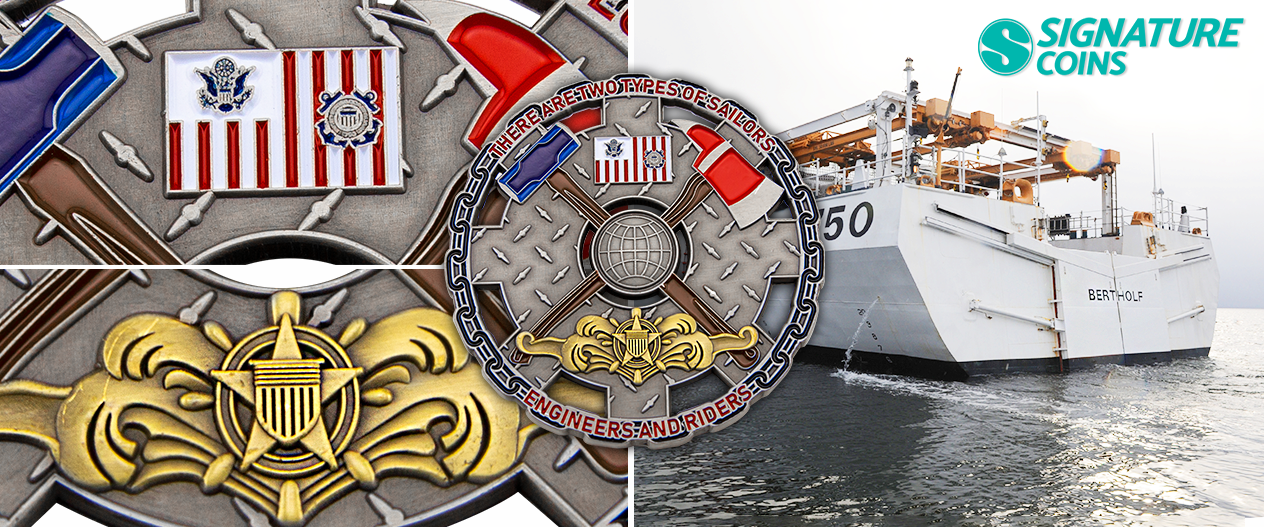In addition to being dual plated, the insignia is also 3D. This gives it a layered and rounded appearance, while also allowing the final look to remain true to the metal pin of the insignia worn by the sailors onboard the USCGC Bertholf. The globe at the center of the coin, surrounded by cutouts, also makes use of the 3D mold for a more realistic look and feel. Each of these design elements would make for an impressive coin in their own right. Combined here, they create a final product that’s truly one of a kind.