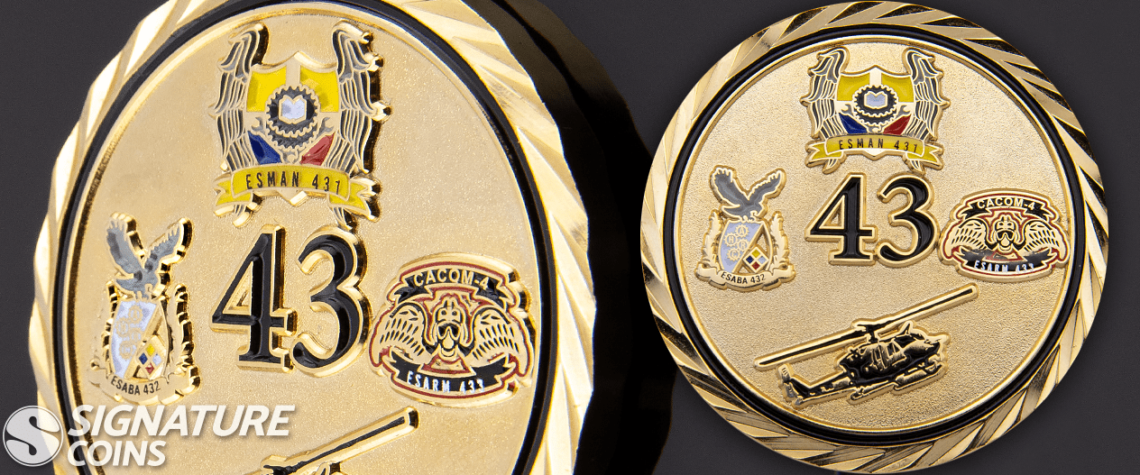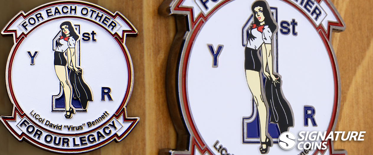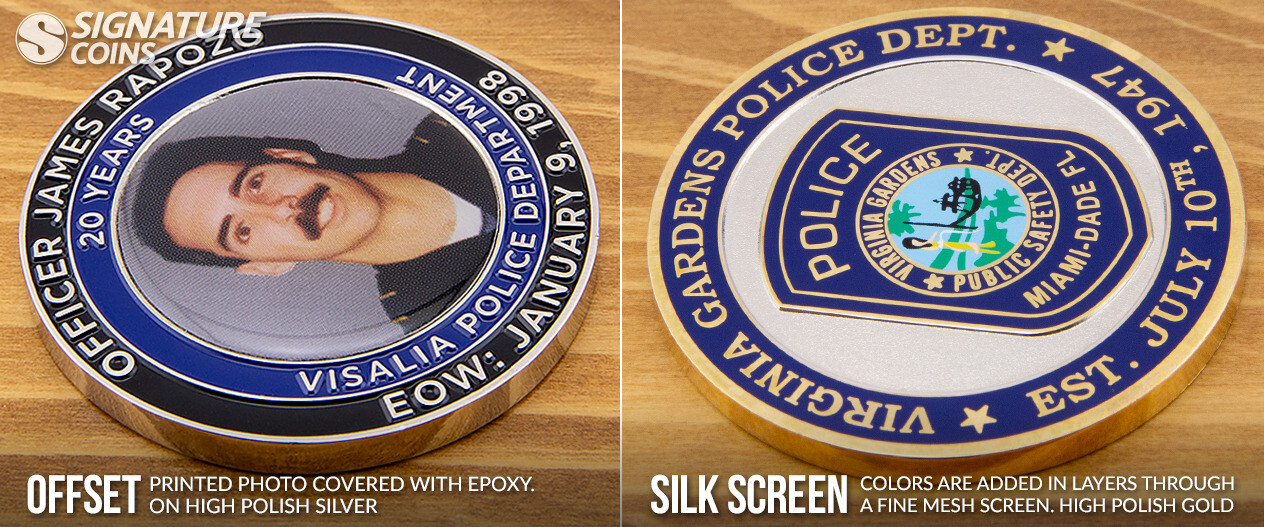 All of our coins are still created via the die striking or die casting method, but when it comes to adding color and images to certain designs, some of our customers choose to go with either offset printing or silk screen printing certain design elements onto their coins. With our standard challenge coins, the addition of color requires separated, recessed levels that can contain the enamel paint and keep the colors from bleeding together. If your design is too detailed to make use of those design elements, then adding offset printing or silk screen printing to your coins is the only way to go.