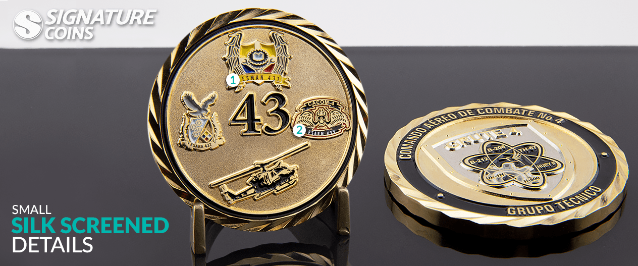 For this coin from the Fuerza Aérea Colombiana (Colombian Air Force), you’d be hard pressed to spot which aspects of it were created via silk screen. In truth, the entire coin was created through the standard die striking and soft enamel process. But on the reverse coin face, you’ll notice the different unit emblems around the number 43. If you’re thinking that those emblems are the aspect of the coin created through silk screen, you’re wrong but getting a lot closer. At the bottom of each emblem is a small banner displaying the unit name. It’s these banners that were created through silk screen printing.