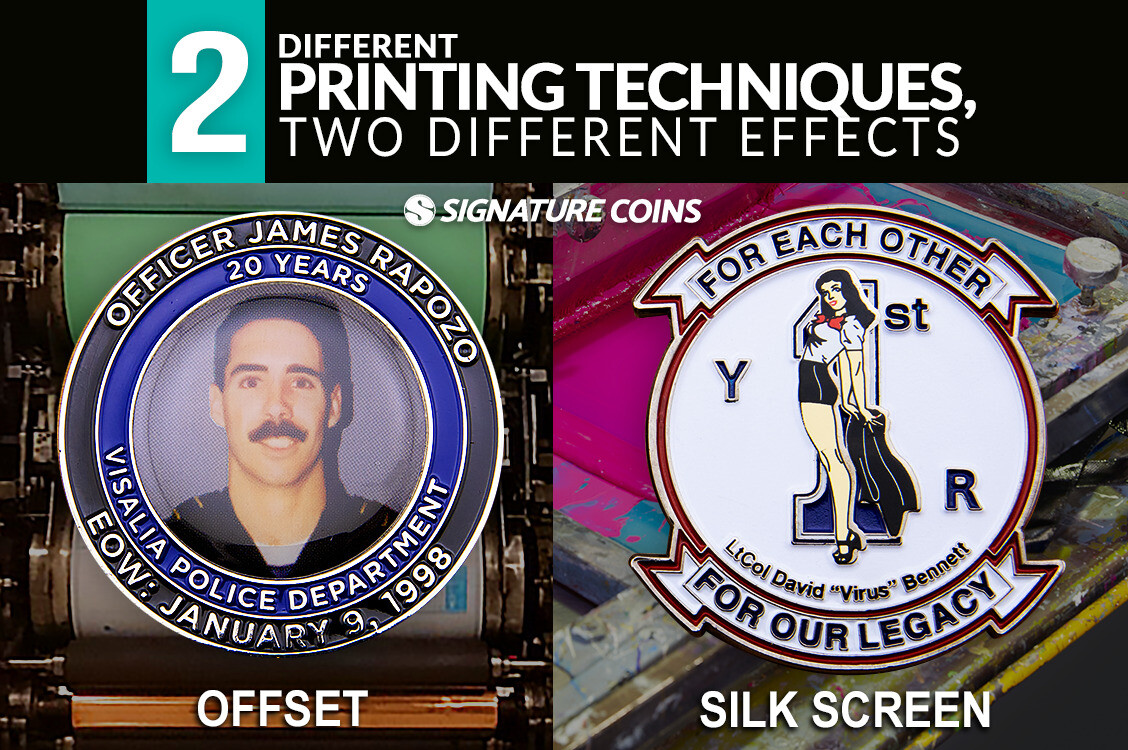 When deciding which way to go with your own set of challenge coins, whether to make use of offset or silk screen printing options will depend on a few factors. First, does your challenge coin design feature images with fine details that can’t be captured in the traditional manner? Keep in mind that faces aren’t captured in the same level of detail with 2D or 3D coins as they can be in photographs. Therefore, offset printing is the best way to go for coins meant to honor or represent specific people.;